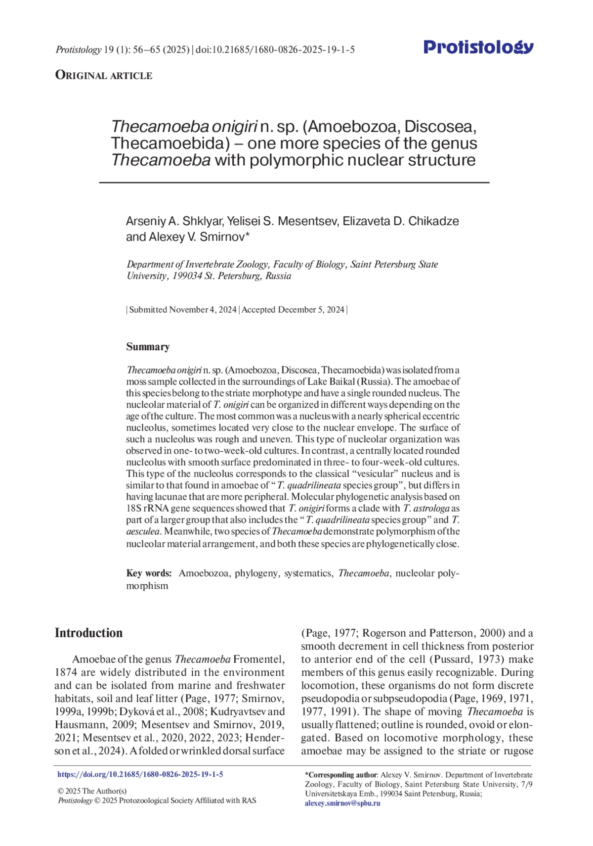 18. Mesentsev Y., Poluzerov S. and Smirnov A. 2024. New data on Thecamoeba striata (Penard, 1890) (Amoebozoa, Discosea, Thecamoebida), and the geographical distribution of “T. striata species group”. Protistology. 18 (2): 113-129. DOI: 10.21685/1680-0826-2024-18-2-3