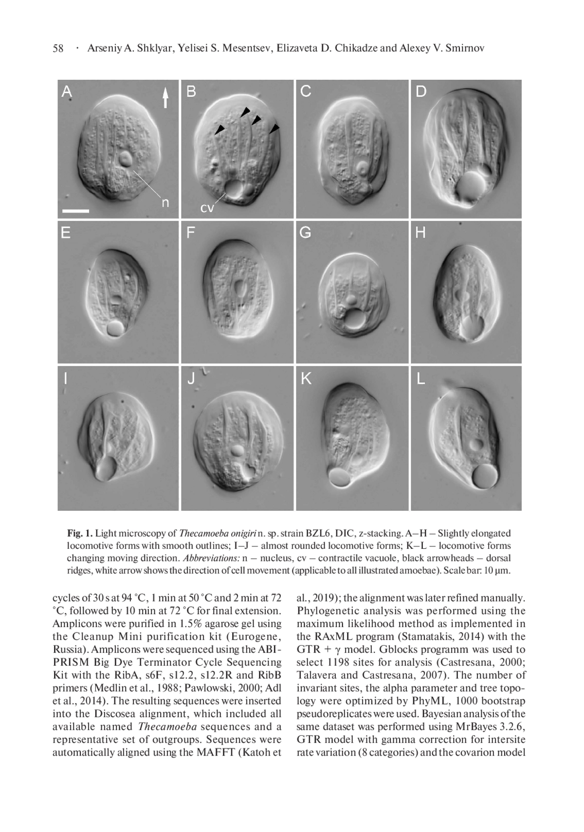 15. Mesentsev Y., Bondarenko N., Nassonova E. and Smirnov A. 2021. Vannella primoblina n. sp.-an unusual species of the genus Vannella (Amoebozoa, Discosea, Vannellida) with pronounced dorsal ridges and folds. Eur. J. Protistol. 77: 125757. DOI: 10.1016/j.ejop.2020.125757