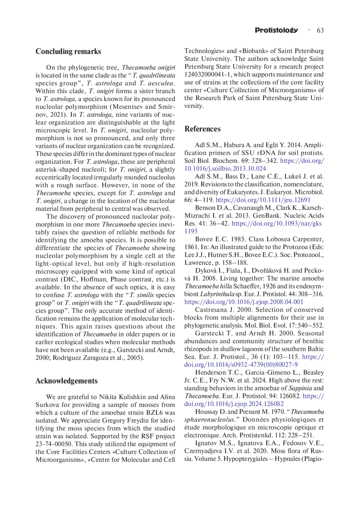 17. Mesentsev Y., Kamyshatskaya O. and Smirnov A. 2020. Thecamoeba foliovenanda n. sp. (Amoebozoa, Discosea, Thecamoebida) - One more case of sibling species among amoebae of the genus Thecamoeba. Eur. J. Protistol. 76: 125716. DOI: 10.1016/j.ejop.2020.125716