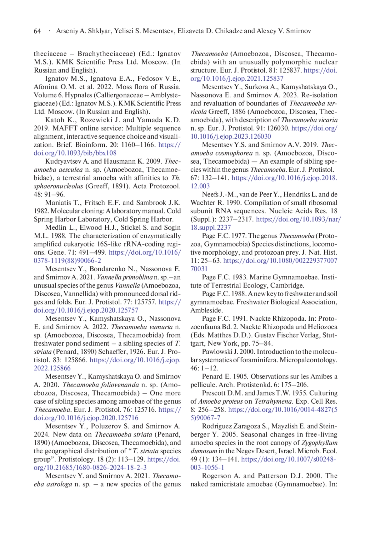 21. Mesentsev Y.S. and Smirnov A.V. 2019. Thecamoeba cosmophorea n. sp. (Amoebozoa, Discosea, Thecamoebida) - An example of sibling species within the genus Thecamoeba. Eur. J. Protistol. 67: 132-141. DOI: 10.1016/j.ejop.2018.12.003