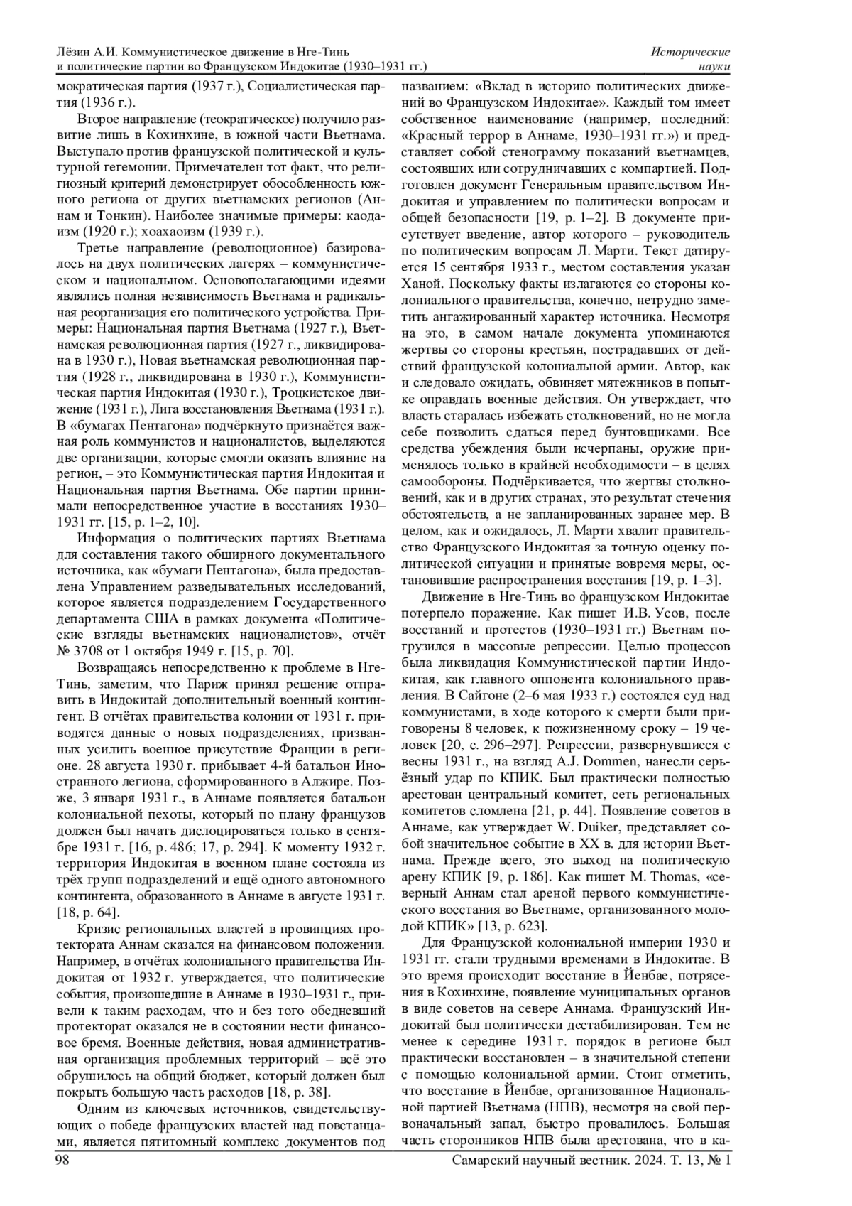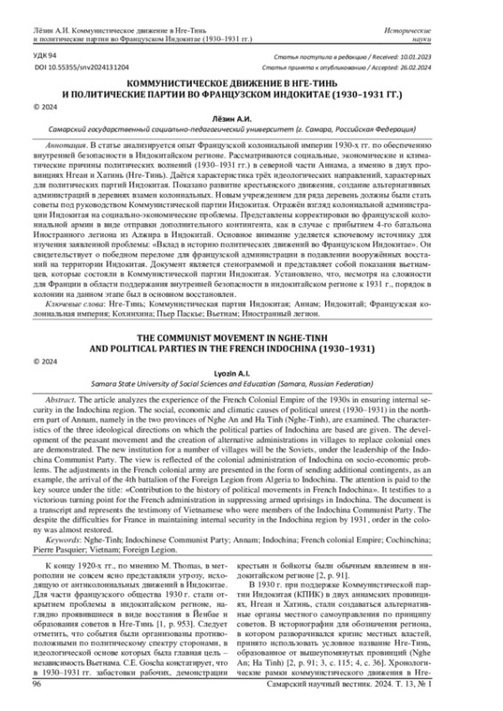 В статье анализируется опыт Французской колониальной империи 1930-х гг. по обеспечению внутренней безопасности в Индокитайском регионе. Рассматриваются социальные, экономические и климатические причины политических волнений (1930-1931 гг.) в северной части Аннама, а именно в двух провинциях Нгеан и Хатинь (Нге-Тинь). Даётся характеристика трёх идеологических направлений, характерных для политических партий Индокитая. Показано развитие крестьянского движения, создание альтернативных администраций в деревнях взамен колониальных. Новым учреждением для ряда деревень должны были стать советы под руководством Коммунистической партии Индокитая. Отражён взгляд колониальной администрации Индокитая на социально-экономические проблемы. Представлены корректировки во французской колониальной армии в виде отправки дополнительного контингента, как в случае с прибытием 4-го батальона Иностранного легиона из Алжира в Индокитай. Основное внимание уделяется ключевому источнику для изучения заявленной проблемы: «Вклад в историю политических движений во Французском Индокитае». Он свидетельствует о победном переломе для французской администрации в подавлении вооружённых восстаний на территории Индокитая. Документ является стенограммой и представляет собой показания вьетнамцев, которые состояли в Коммунистической партии Индокитая. Установлено, что, несмотря на сложности для Франции в области поддержания внутренней безопасности в индокитайском регионе к 1931 г., порядок в колонии на данном этапе был в основном восстановлен.