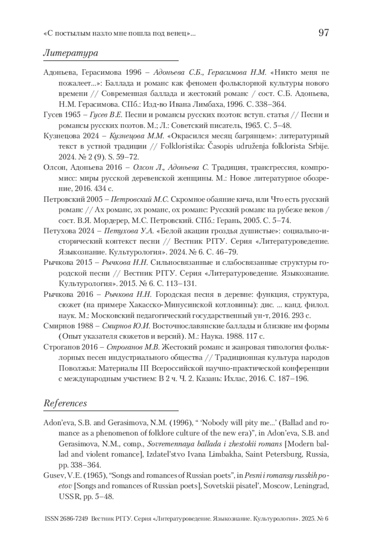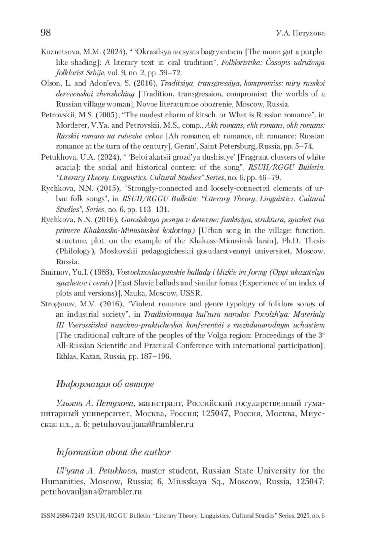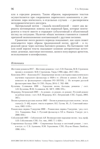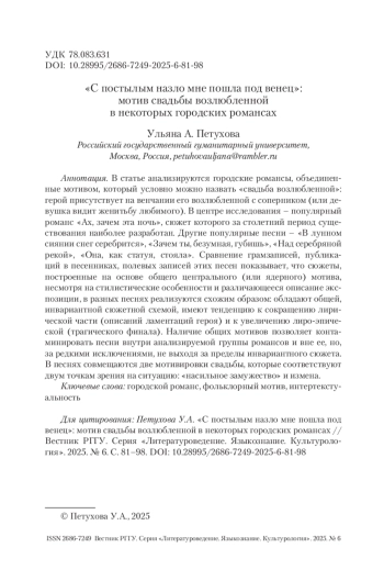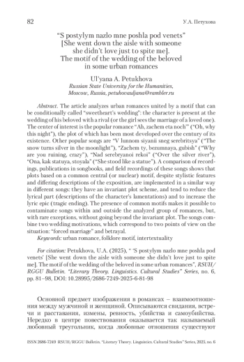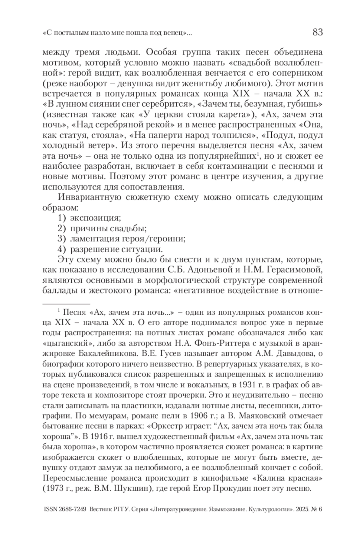 В статье анализируются городские романсы, объединенные мотивом, который условно можно назвать «свадьба возлюбленной»: герой присутствует на венчании его возлюбленной с соперником (или девушка видит женитьбу любимого). В центре исследования – популярный романс «Ах, зачем эта ночь», сюжет которого за столетний период существования наиболее разработан. Другие популярные песни – «В лунном сиянии снег серебрится», «Зачем ты, безумная, губишь», «Над серебряной рекой», «Она, как статуя, стояла». Сравнение грамзаписей, публикаций в песенниках, полевых записей этих песен показывает, что сюжеты, построенные на основе общего центрального (или ядерного) мотива, несмотря на стилистические особенности и различающееся описание экспозиции, в разных песнях реализуются схожим образом: обладают общей, инвариантной сюжетной схемой, имеют тенденцию к сокращению лирической части (описаний ламентаций героя) и к увеличению лиро-эпической (трагического финала). Наличие общих мотивов позволяет контаминировать песни внутри анализируемой группы романсов и вне ее, но, за редкими исключениями, не выходя за пределы инвариантного сюжета. В песнях совмещаются две мотивировки свадьбы, которые соответствуют двум точкам зрения на ситуацию: «насильное замужество» и измена.