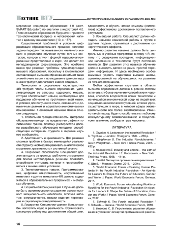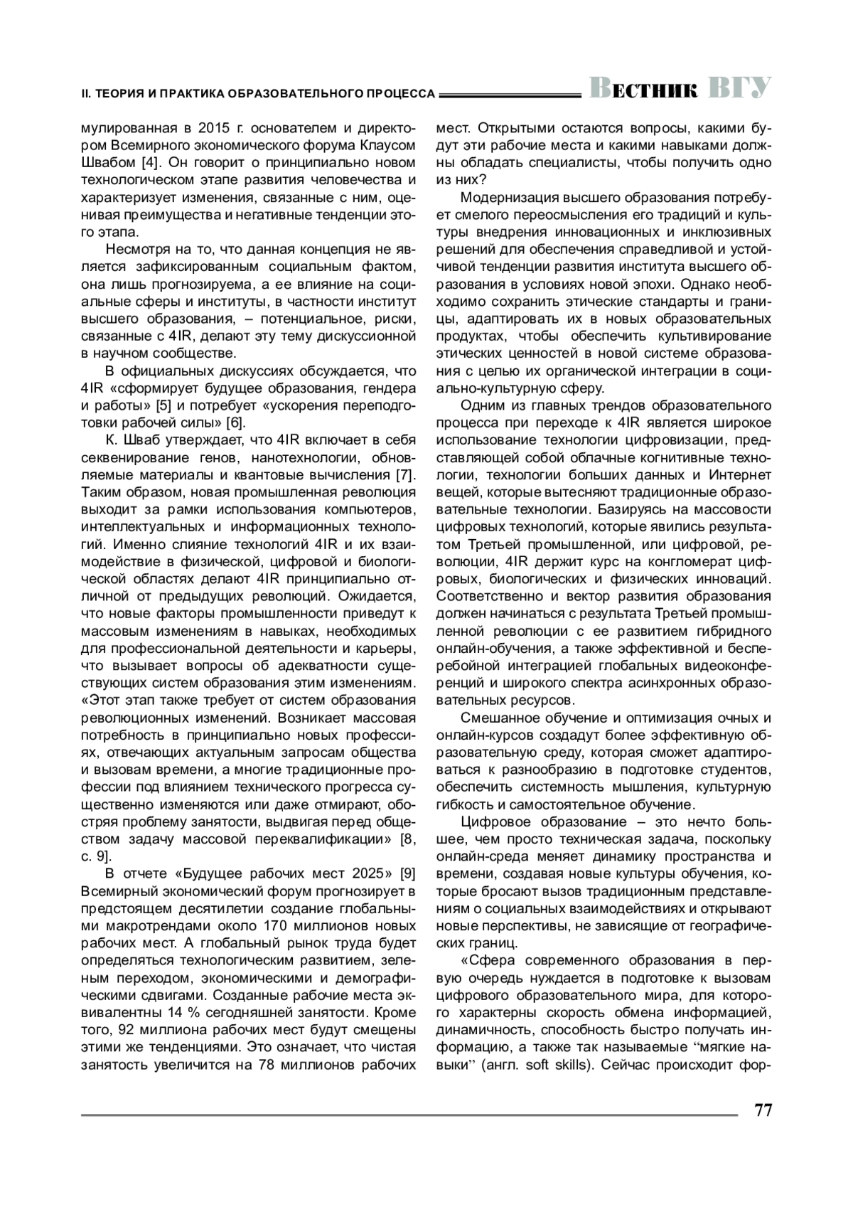 8. 	Иванова С. В. Перспективы развития образования в условиях Четвертой промышленной револю ции / С. В. Иванова, О. Б. Иванов // Этап: экономическая теория, анализ, практика. - 2019. - № 6. - С. 7-30.