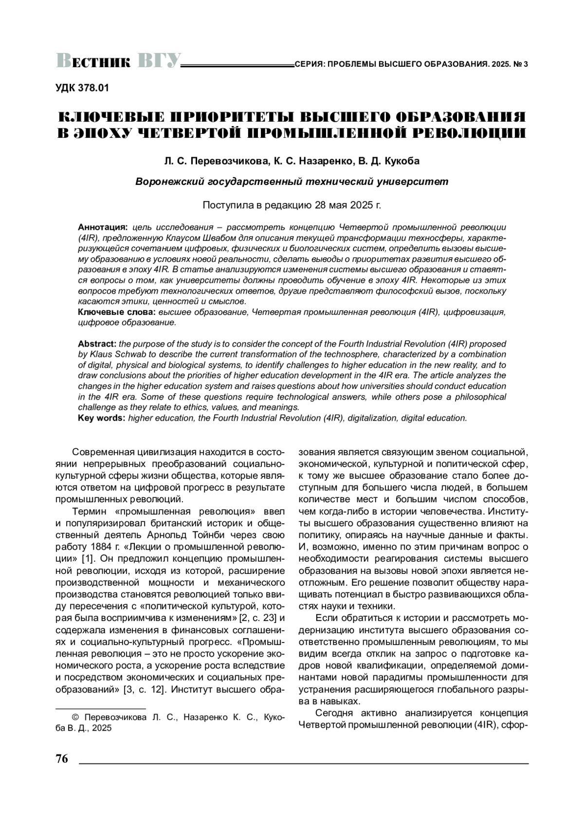 Цель исследования - рассмотреть концепцию Четвертой промышленной революции (4IR), предложенную Клаусом Швабом для описания текущей трансформации техносферы, характеризующейся сочетанием цифровых, физических и биологических систем, определить вызовы высшему образованию в условиях новой реальности, сделать выводы о приоритетах развития высшего образования в эпоху 4IR. В статье анализируются изменения системы высшего образования и ставятся вопросы о том, как университеты должны проводить обучение в эпоху 4IR. Некоторые из этих вопросов требуют технологических ответов, другие представляют философский вызов, поскольку касаются этики, ценностей и смыслов.