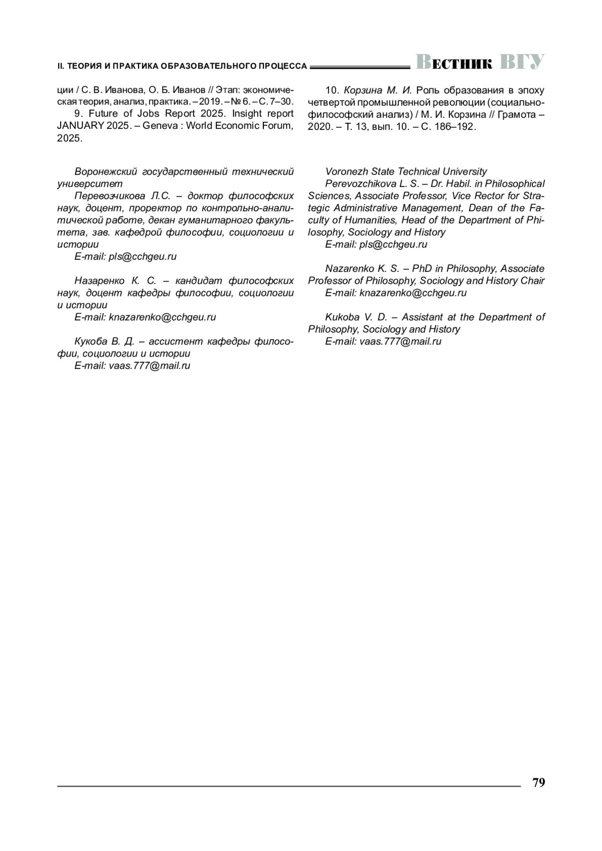 10. 	Корзина М. И. Роль образования в эпоху четвертой промышленной революции (социально-философский анализ) / М. И. Корзина // Грамота - 2020. - Т. 13, вып. 10. - С. 186-192.