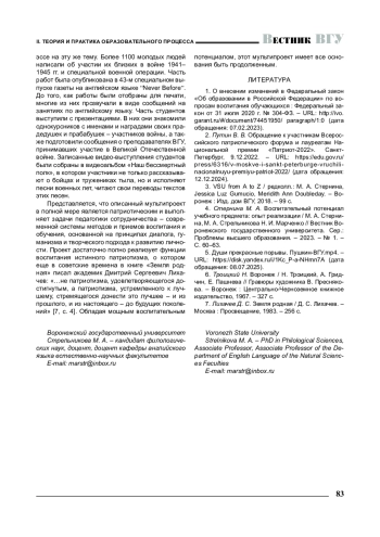 4. 	Стернина М. А. Воспитательный потенциал учебного предмета: опыт реализации / М. А. Стернина, М. А. Стрельникова Н. И. Марченко // Вестник Воронежского государственного университета. Сер.: Проблемы высшего образования. - 2023. - № 1. - С. 60-63.
