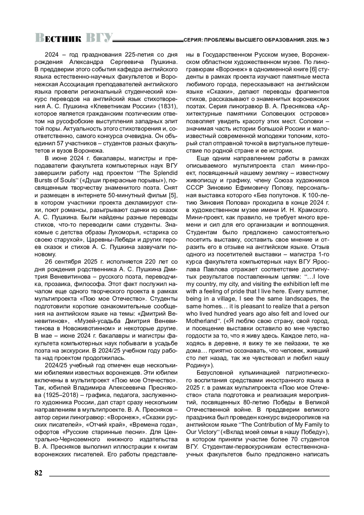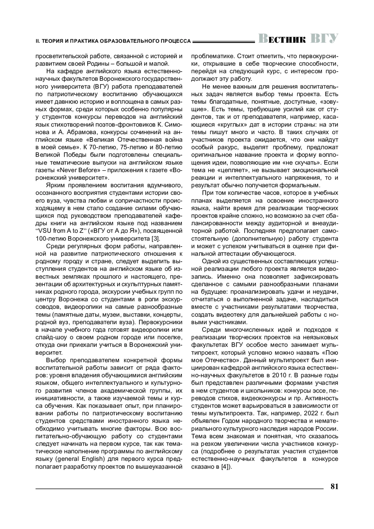 Среди многочисленных идей и подходов к реализации творческих проектов на неязыковых факультетах ВГУ особое место занимает мультипроект, который условно можно назвать «Пою мое Отечество». Данный мультипроект был инициирован кафедрой английского языка естественно-научных факультетов в 2010 г. В разные годы был представлен различными формами участия в нем студентов и школьников: конкурсы эссе, переводов стихов, видеоконкурсы и пр. Активность студентов может варьироваться в зависимости от темы мультипроекта. Так, например, 2022 г. был объявлен Годом народного творчества и нематериального культурного наследия народов России. Тема всем знакомая и понятная, что сказалось на резком увеличении числа участников конкурса (подробнее о результатах участия студентов естественно-научных факультетов в конкурсе сказано в [4]).