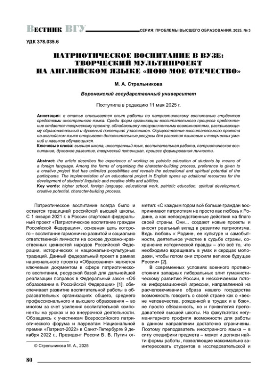 В статье описывается опыт работы по патриотическому воспитанию студентов средствами иностранного языка. Среди форм организации воспитательного процесса предпочтение отдается творческому проекту, обладающему неограниченными возможностями, раскрывающему образовательный и духовный потенциал участников. Осуществление воспитательного проекта на английском языке открывает дополнительные ресурсы для развития языковых и творческих умений и навыков обучающихся.