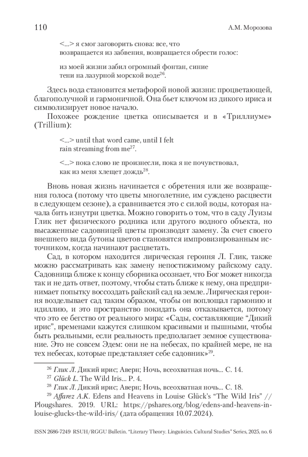В поэтическом сборнике «Дикий ирис» пространство сада становится важным образом – связующим звеном между всеми стихотворениями, позволяющим создать этот цикл. Л. Глик конструирует герметичное пространство сада, обладающее идиллическими характеристиками, которое я предлагаю рассматривать как топос «прелестный уголок» (Э. Р. Курциус). Определение Э. Р. Курциуса показывает соответствующую многогранность топоса, которая характерна для сада в «Диком ирисе» и выражается в его двойственности. Таким образом, в статье сад рассматривается не только как стилистический, но и структурный элемент цикла в американской поэзии второй половины ХХ в.