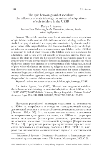 В статье рассматриваются девять советских анимационных экранизаций эпического фольклора в контексте влияния на них государственной идеологии. Исследуемая категория анимационных экранизаций характеризуется практически полным сохранением оригинального фольклорного сюжета. Для понимания степени идеологического влияния на анимационные экранизации эпического фольклора в СССР необходимо уточнить, какие варианты фольклорного произведения не были выбраны для экранизации, то есть оказались неподходящими под идеологические критерии. Те версии сюжета, в которых подвиги совершались героями безотносительно к княжеской власти, были более предпочтительны для экранизации, чем те, в которых действия героев продиктованы представителем правящего класса. Вместо сюжетов, где героями движет религиозная мотивация, советскими режиссерами-мультипликаторами для экранизации были выбраны варианты с мотивацией светской. Анимационные богатыри идеализируются, выступая олицетворением всего советского общества, тогда как их противники могут отсылать к реальным внешнеполитическим противникам периода создания экранизации.