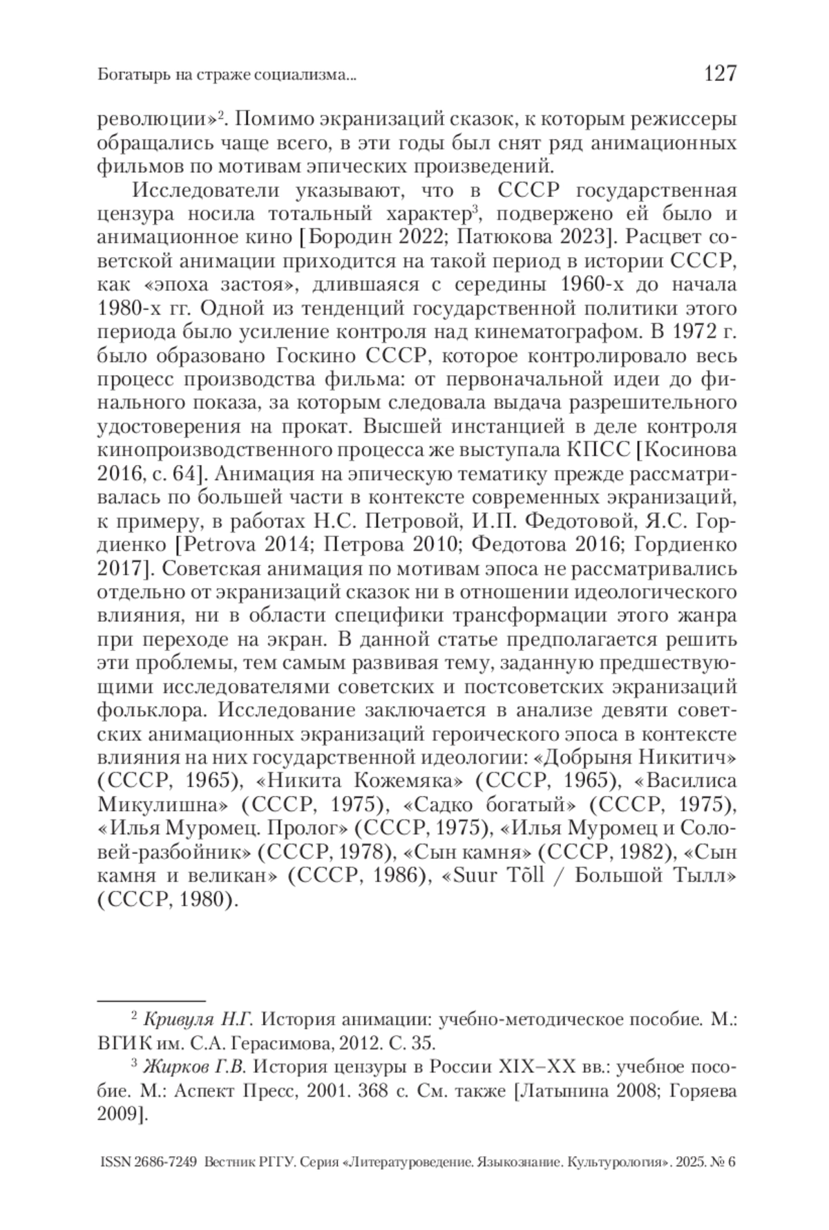13. Патюкова 2023 - Патюкова Р.В. Цензура в мультипликации: исторический аспект // Вестник Волжского университета имени В.Н. Татищева. 2023. Т. 2. № 2 (41). С. 193-199.
