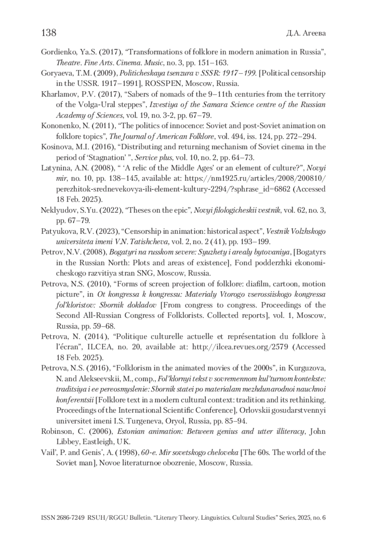 8. Гордиенко 2017 - Гордиенко Я.С. Трансформации фольклора в современной анимации России // Театр. Живопись. Кино. Музыка. 2017. № 3. С. 151-163.