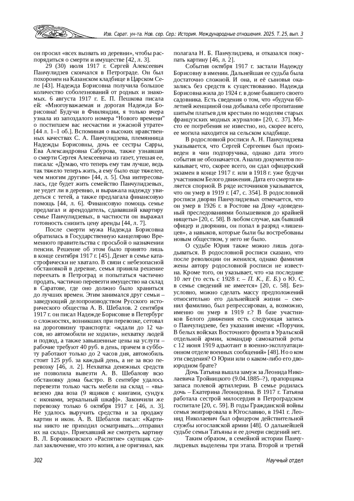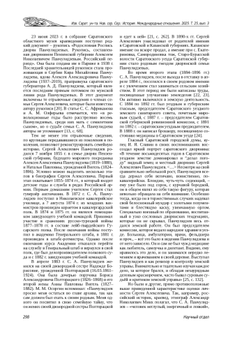 В статье на основе комплекса документальных материалов и научной литературы реконструирована история семьи дворянского рода Панчулидзевых во второй половине XIX – начале XX в. Воссоздана биография Сергея Алексеевича Панчулидзева, показана его роль в качестве земского деятеля Саратовской губернии, в Совете объединенного дворянства и исследователя истории Российской армии. Выявлены условия жизни семьи Панчулидзевых в период Великой российской революции и доказана безуспешность их социальных практик выживания в экстремальных условиях революционного времени.