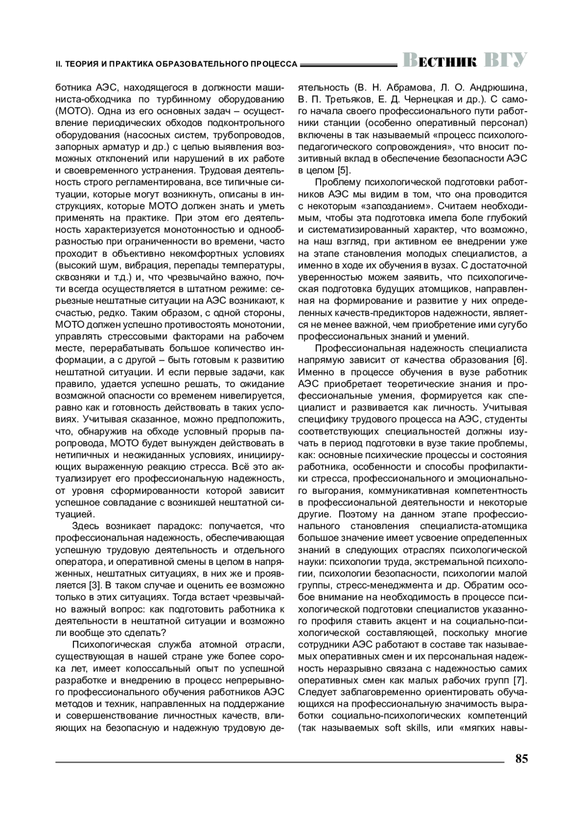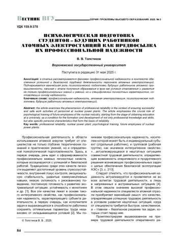 В статье рассматривается феномен профессиональной надежности в контексте обеспечения успешной и безопасной трудовой деятельности персонала атомных электростанций. Подчеркивается важнейшая роль психологической подготовки будущих работников атомной промышленности, начиная с этапа получения образования в вузе как условия становления и развития не только профессиональных знаний и умений, но и специфических личностных характеристик, составляющих основу надежности.