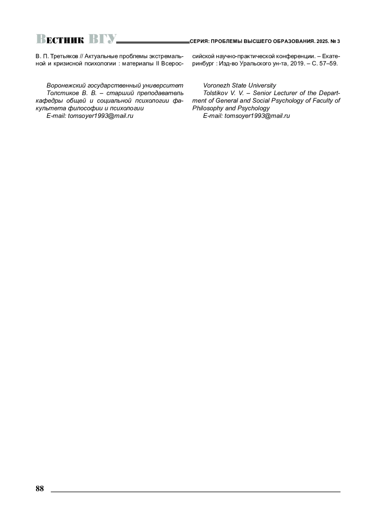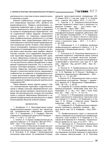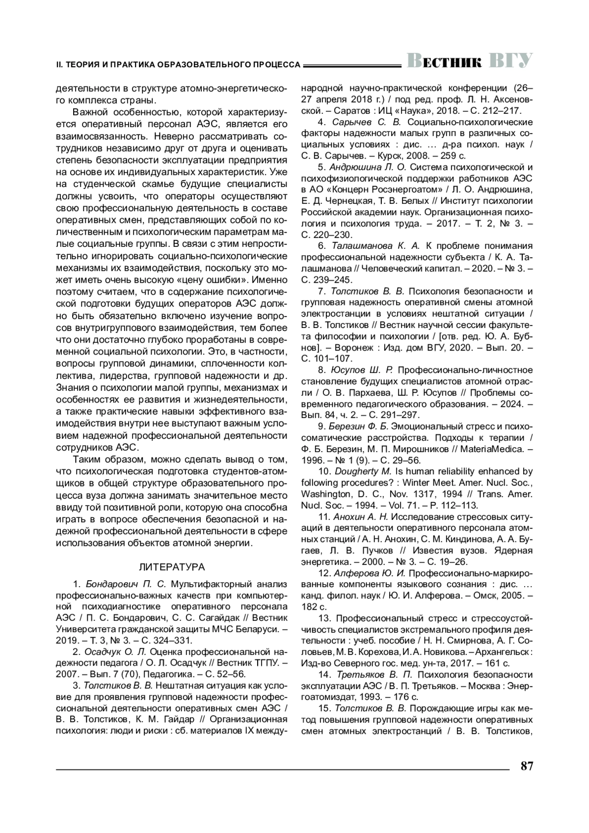 7. Толстиков В. В. Психология безопасности и групповая надежность оперативной смены атомной электростанции в условиях нештатной ситуации / B. В. Толстиков // Вестник научной сессии факультета философии и психологии / [отв. ред. Ю. А. Бубнов]. - Воронеж : Изд. дом ВГУ, 2020. - Вып. 20. - C. 101-107.