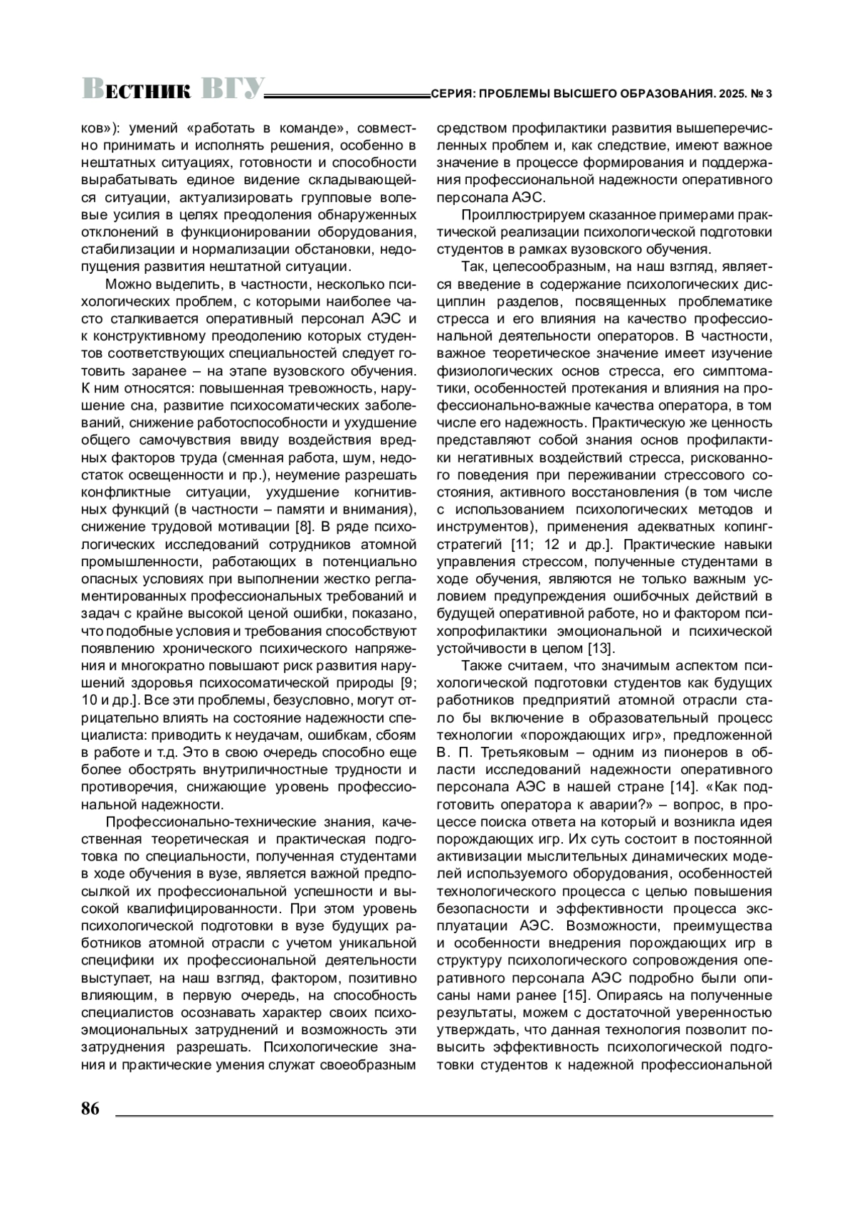 Можно выделить, в частности, несколько психологических проблем, с которыми наиболее часто сталкивается оперативный персонал АЭС и к конструктивному преодолению которых студентов соответствующих специальностей следует готовить заранее – на этапе вузовского обучения. К ним относятся: повышенная тревожность, нарушение сна, развитие психосоматических заболеваний, снижение работоспособности и ухудшение общего самочувствия ввиду воздействия вредных факторов труда (сменная работа, шум, недостаток освещенности и пр.), неумение разрешать конфликтные ситуации, ухудшение когнитивных функций (в частности – памяти и внимания), снижение трудовой мотивации [8]. В ряде психологических исследований сотрудников атомной промышленности, работающих в потенциально опасных условиях при выполнении жестко регламентированных профессиональных требований и задач с крайне высокой ценой ошибки, показано, что подобные условия и требования способствуют появлению хронического психического напряжения и многократно повышают риск развития нарушений здоровья психосоматической природы [9; 10 и др.].