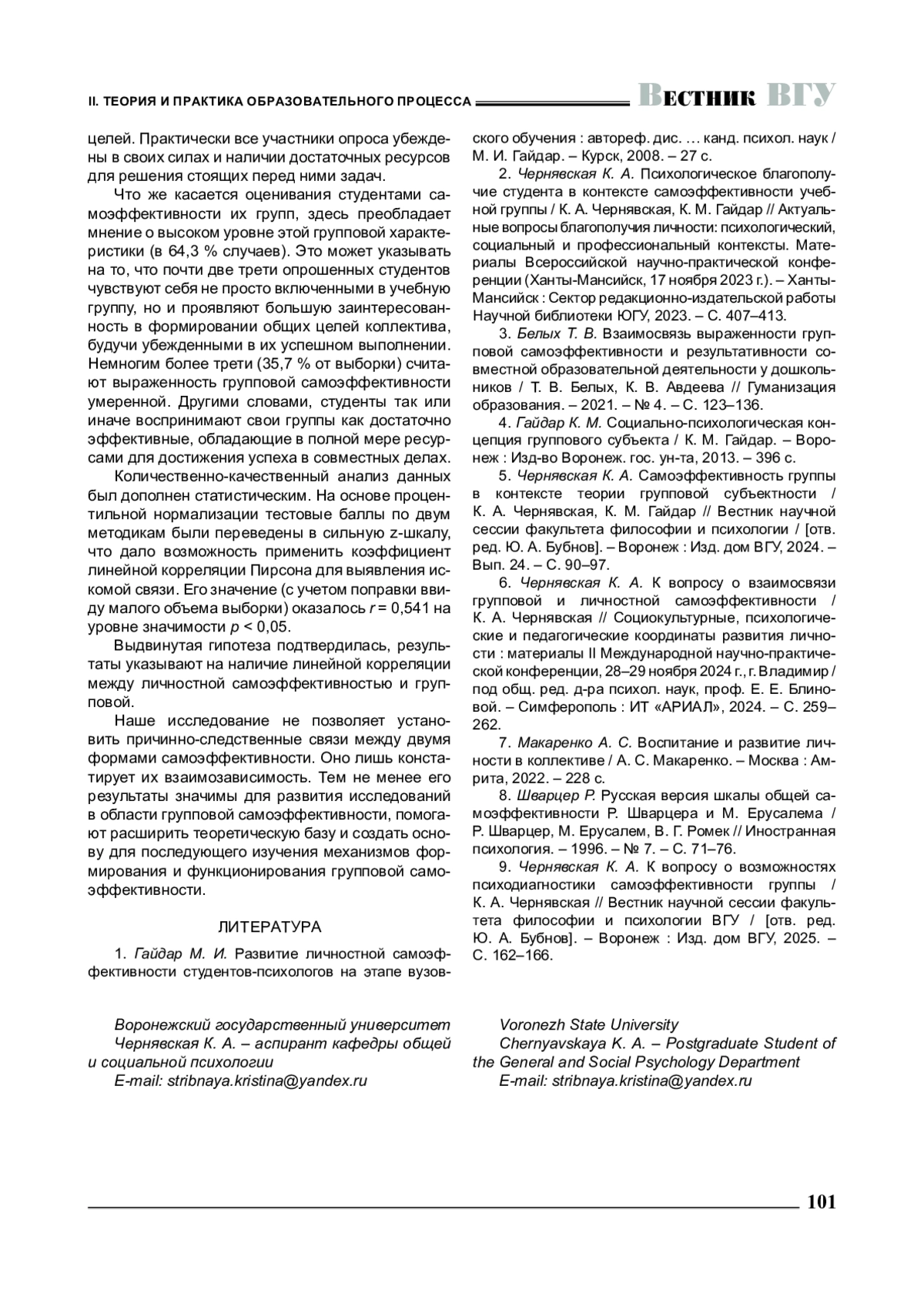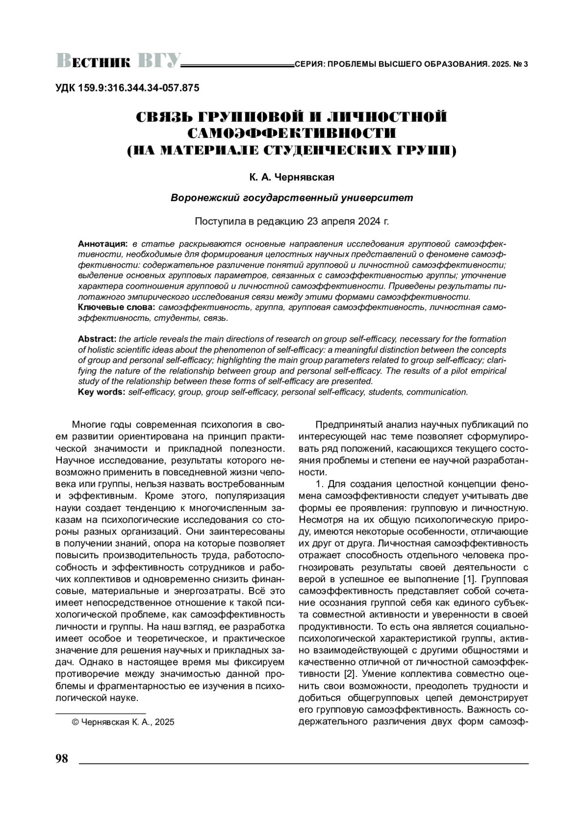 9. 	Чернявская К. А. К вопросу о возможностях психодиагностики самоэффективности группы / К. А. Чернявская // Вестник научной сессии факультета философии и психологии ВГУ / [отв. ред. Ю. А. Бубнов]. - Воронеж : Изд. дом ВГУ, 2025. - С.162-166.