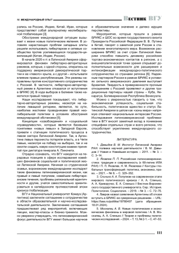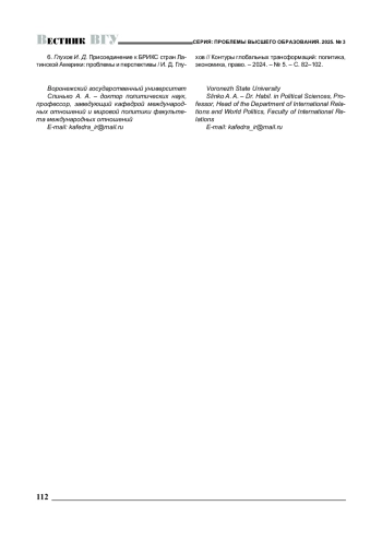 6. 	Глухов И. Д. Присоединение к БРИКС стран Латинской Америки: проблемы и перспективы / И. Д. Глухов // Контуры глобальных трансформаций: политика, экономика, право. - 2024. - № 5. - С. 82-102.