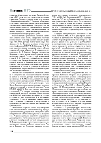 В настоящее время национальные научно-исследовательские центры по латиноамериканской проблематике существуют во многих странах. Институт Латинской Америки РАН, являясь лидером академической науки в сфере латиноамериканистики, вносит важный вклад в развитие образовательного процесса высшей школы в таких областях, как мировая экономика и международные отношения, регионоведение и мировая политика [1].