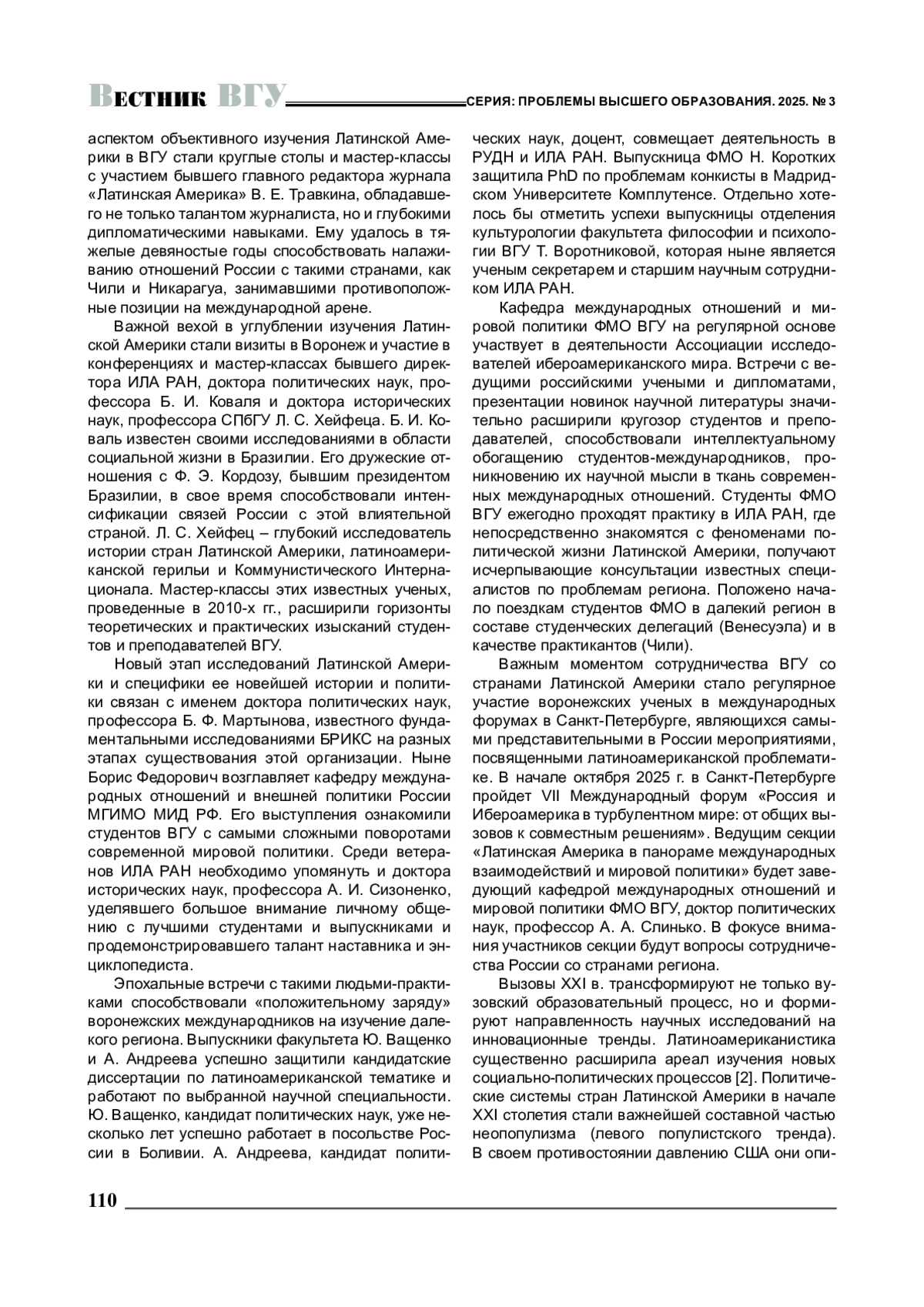 В начале XXI в. в Воронежском государственном университете активизировалось изучение политических и социально-экономических особенностей развития латиноамериканского региона во взаимодействии с Институтом Латинской Америки РАН и другими научными и образовательными учреждениями. Научные исследования позволили российским ученым адекватно представить новые феномены социально-политической жизни стран Латинской Америки. Сотрудничество в рамках международных организаций дает возможность переосмыслить в образовательном процессе и в ходе научных исследований взаимодействие России и Латинской Америки в разных сферах экономической, политической и социальной жизни.