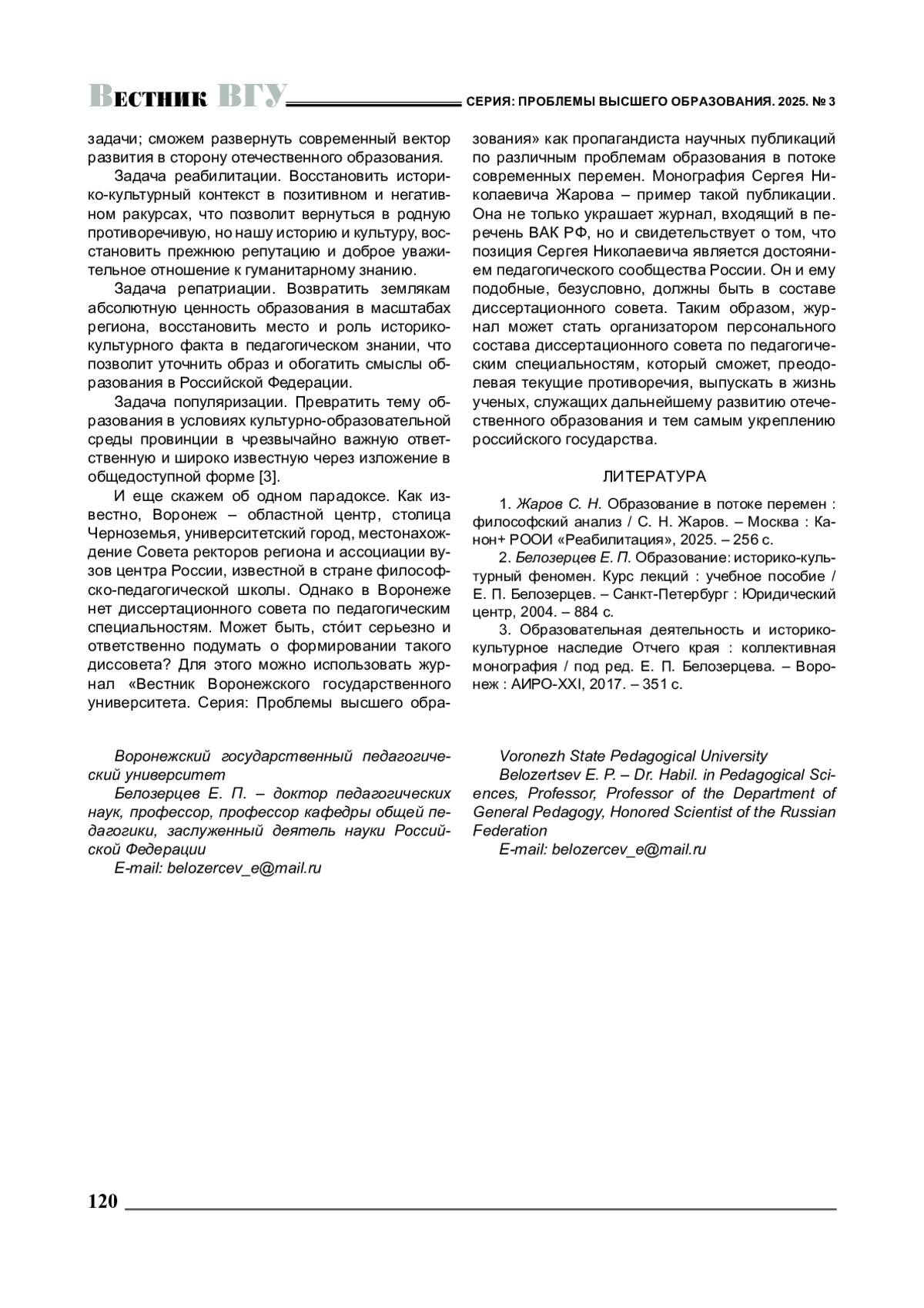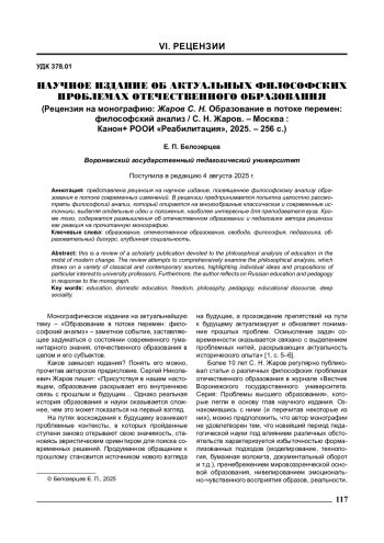 1. 	Жаров С. Н. Образование в потоке перемен : философский анализ / С. Н. Жаров. - Москва : Канон+ РООИ «Реабилитация», 2025. - 256 с.