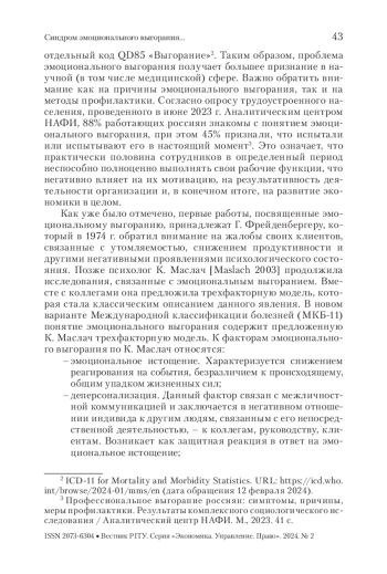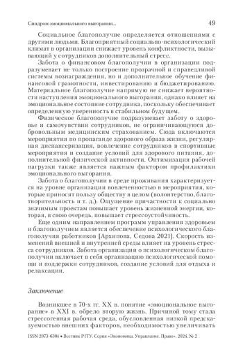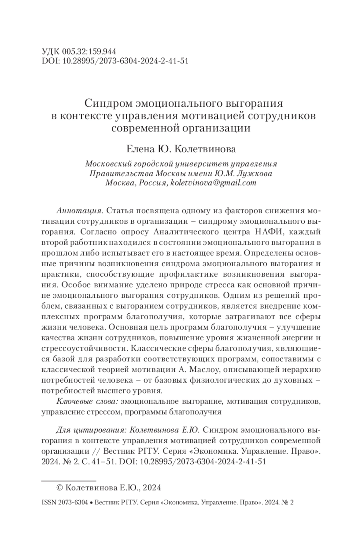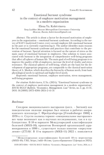 Статья посвящена одному из факторов снижения мотивации сотрудников в организации – синдрому эмоционального выгорания. Согласно опросу Аналитического центра НАФИ, каждый второй работник находился в состоянии эмоционального выгорания в прошлом либо испытывает его в настоящее время. Определены основные причины возникновения синдрома эмоционального выгорания и практики, способствующие профилактике возникновения выгорания. Особое внимание уделено природе стресса как основной причине эмоционального выгорания сотрудников. Одним из решений проблем, связанных с выгоранием сотрудников, является внедрение комплексных программ благополучия, которые затрагивают все сферы жизни человека. Основная цель программ благополучия – улучшение качества жизни сотрудников, повышение уровня жизненной энергии и стрессоустойчивости. Классические сферы благополучия, являющиеся базой для разработки соответствующих программ, сопоставимы с классической теорией мотивации А. Маслоу, описывающей иерархию потребностей человека – от базовых физиологических до духовных – потребностей высшего уровня.