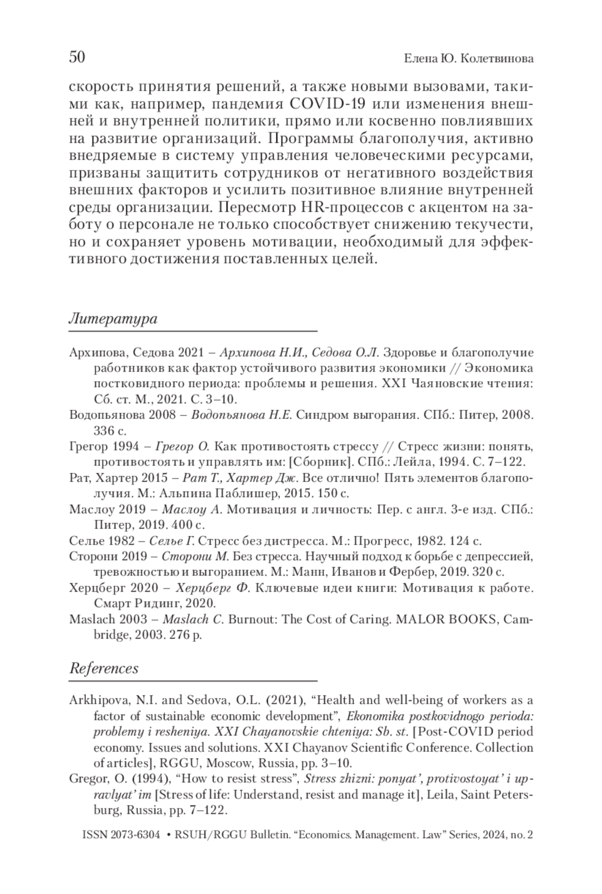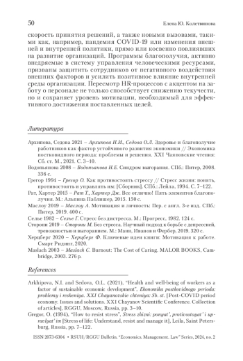 1. Архипова, Седова 2021 - Архипова Н.И., Седова О.Л. Здоровье и благополучие работников как фактор устойчивого развития экономики // Экономика постковидного периода: проблемы и решения. XXI Чаяновские чтения: Сб. ст. М., 2021. С. 3-10.