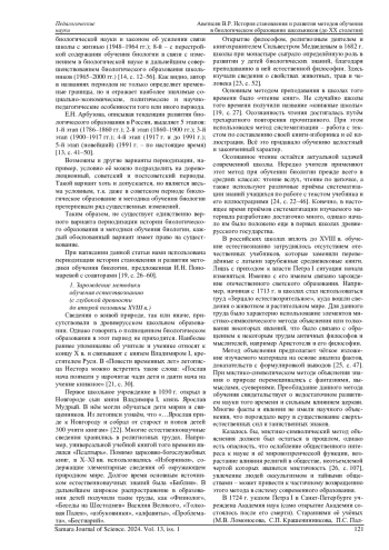 В педагогической деятельности немаловажную роль в становлении профессиональных качеств школьного учителя играет освоение им методов обучения тому или иному предмету. Понимая эту значимость, мы используем опыт других педагогов, методистов, учёных. Изучая и анализируя их труды, обращаемся к истории становления и развития методов обучения. В данной статье сделан акцент на проведение исторического обзора развития методов обучения в биологическом образовании школьников. На основе исторической ретроспективы представлены основные труды видных педагогов-биологов, описан их вклад в развитие методики обучения естествознанию и биологии. Приведены основные внешние и внутренние факторы, влиявшие на образовательный процесс. В частности, отношение государственной власти к естественнонаучному образованию. В статье рассмотрены основные варианты периодизации истории становления и развития методики обучения биологии и биологического образования в отечественной школе; дана характеристика отдельным периодам и методам обучения, преобладающим в данный момент; сделаны указания на использование тех или иных методов обучения биологии в современном образовании. Исходя из заявленной темы исследования, приведены сведения, отражающие развитие методов обучения биологии только до XX столетия.