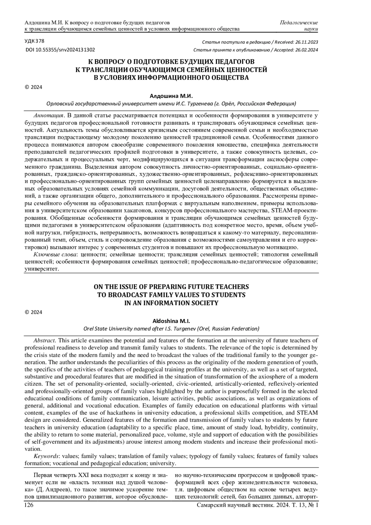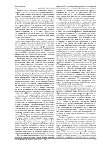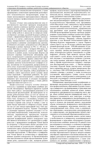 В данной статье рассматривается потенциал и особенности формирования в университете у будущих педагогов профессиональной готовности развивать и транслировать обучающимся семейных ценностей. Актуальность темы обусловливается кризисным состоянием современной семьи и необходимостью трансляции подрастающему молодому поколению ценностей традиционной семьи. Особенностями данного процесса понимаются автором своеобразие современного поколения юношества, специфика деятельности преподавателей педагогических профилей подготовки в университете, а также совокупность целевых, содержательных и процессуальных черт, модифицирующихся в ситуации трансформации аксиосферы современного гражданина. Выделенная автором совокупность личностно-ориентированных, социально-ориентированных, гражданско-ориентированных, художественно-ориентированных, рефлексивно-ориентированных и профессионально-ориентированных групп семейных ценностей целенаправленно формируется в выделенных образовательных условиях семейной коммуникации, досуговой деятельности, общественных объединений, а также организации общего, дополнительного и профессионального образования. Рассмотрены примеры семейного обучения на образовательных платформах с виртуальным наполнением, примеры использования в университетском образовании хакатонов, конкурсов профессионального мастерства, STEAM-проектирования. Обобщенные особенности формирования и трансляции обучающимся семейных ценностей будущими педагогами в университетском образовании (адаптивность под конкретное место, время, объем учебной нагрузки, гибридность, непрерывность, возможность возвращаться к какому-то материалу, персонализированный темп, объем, стиль и сопровождение образования с возможностями самоуправления и его корректировки) вызывают интерес у современных студентов и повышают их профессиональную мотивацию.