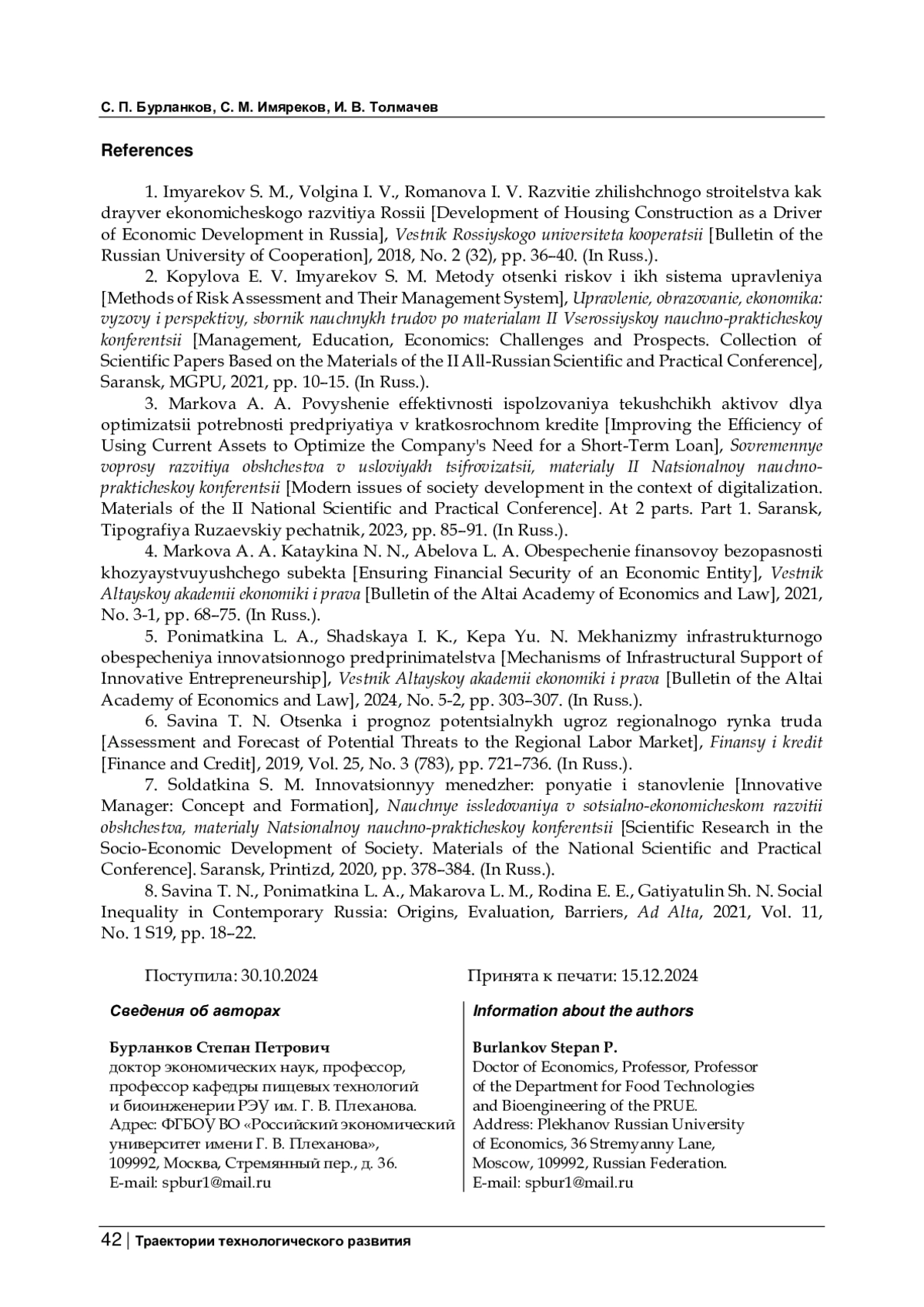 Ponimatkina L. A., Shadskaya I. K., Kepa Yu. N. Mekhanizmy infrastrukturnogo obespecheniya innovatsionnogo predprinimatelstva [Mechanisms of Infrastructural Support of Innovative Entrepreneurship], Vestnik Altayskoy akademii ekonomiki i prava [Bulletin of the Altai Academy of Economics and Law], 2024, No. 5-2, pp. 303-307. (In Russ.).