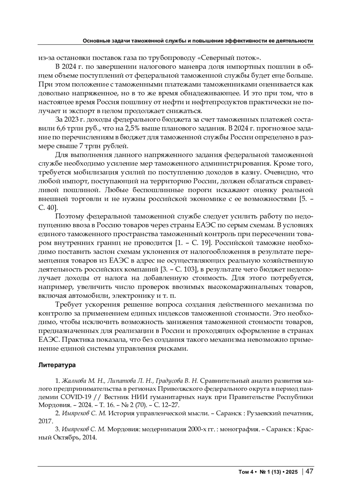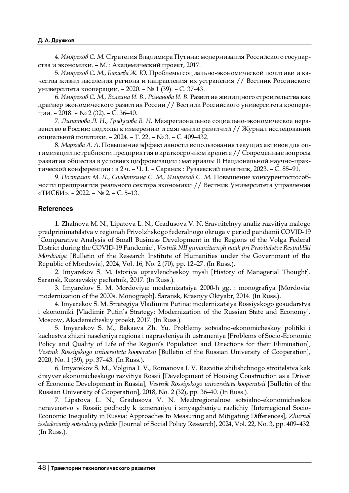 1. 	Жалнова М. Н., Липатова Л. Н., Градусова В. Н. Сравнительный анализ развития малого предпринимательства в регионах Приволжского федерального округа в период пандемии COVID-19 // Вестник НИИ гуманитарных наук при Правительстве Республики Мордовия. - 2024. - Т. 16. - № 2 (70). - С. 12-27. EDN: CUDHYU