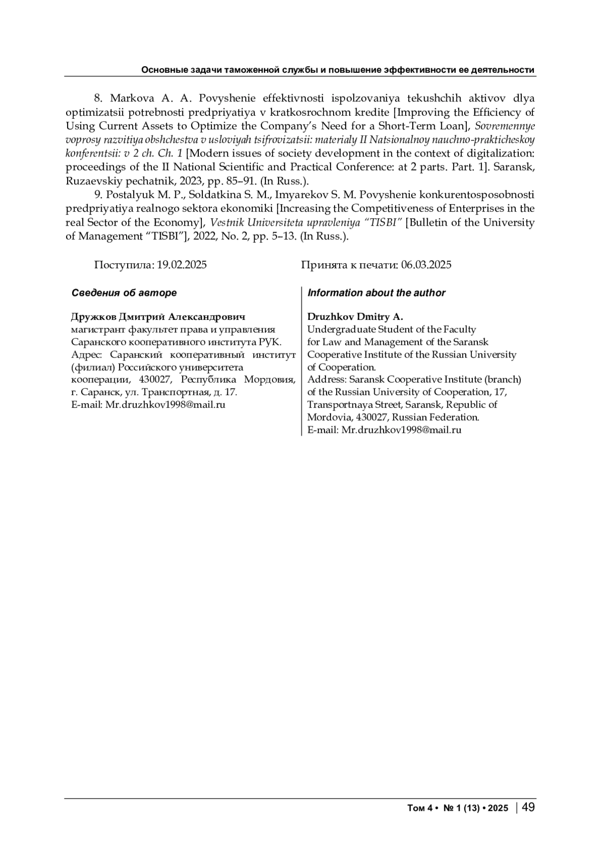 8. 	Маркова А. А. Повышение эффективности использования текущих активов для оптимизации потребности предприятия в краткосрочном кредите // Современные вопросы развития общества в условиях цифровизации: материалы II Национальной научно-практической конференции: в 2 ч. - Ч. 1. - Саранск: Рузаевский печатник, 2023. - С. 85-91. EDN: ALASWB