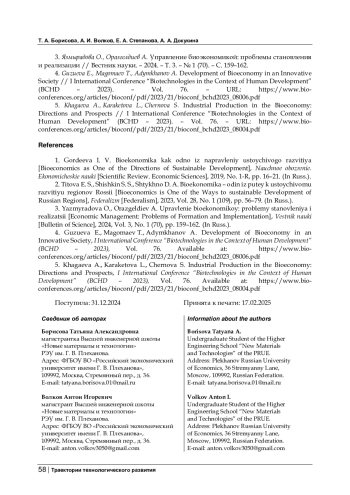 4. Guzueva E., Magomaev T., Adymkhanov A. Development of Bioeconomy in an Innovative Society // I International Conference “Biotechnologies in the Context of Human Development” (BCHD - 2023). - Vol. 76. - URL: https://www.bioconferences.org/articles/bioconf/pdf/2023/21/bioconf_bchd2023_08006.pdf
