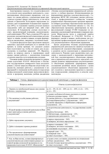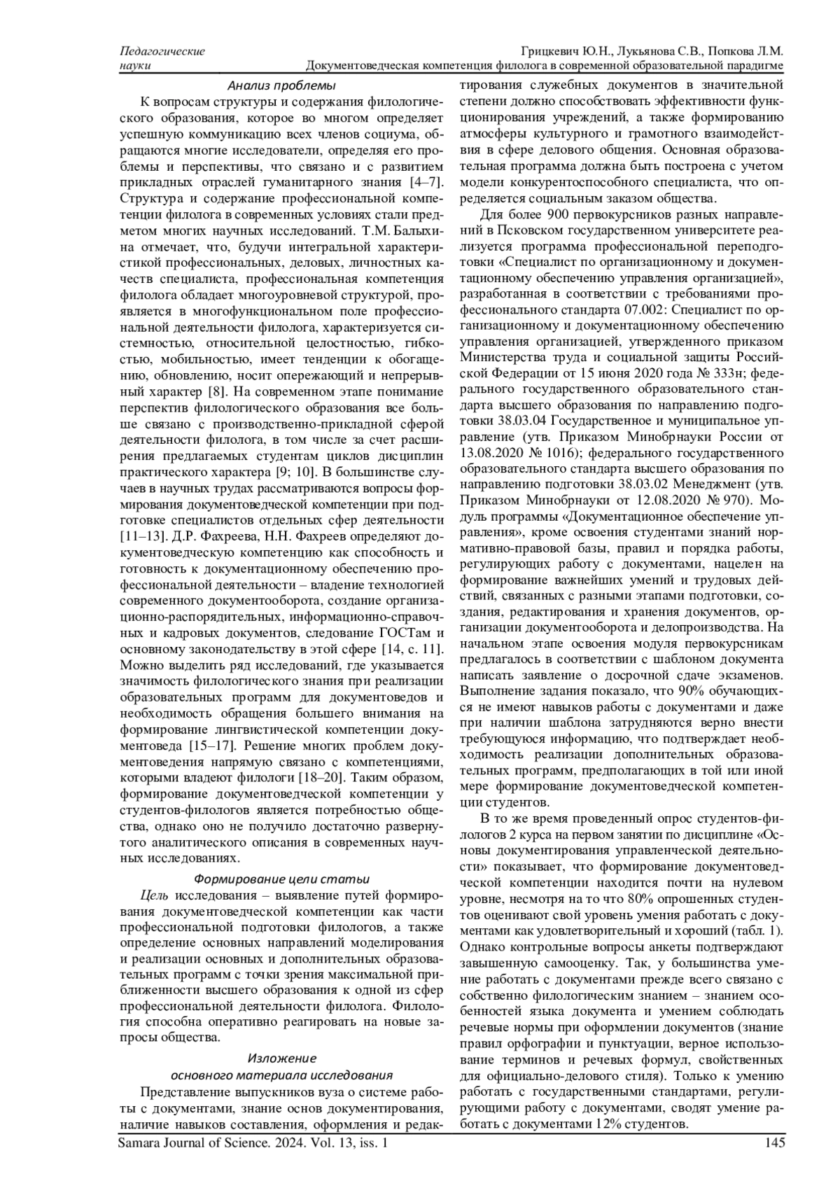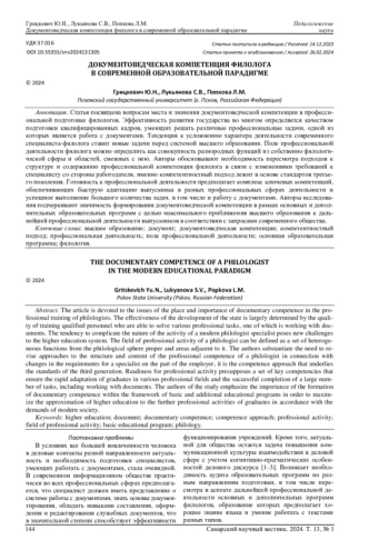 Статья посвящена вопросам места и значения документоведческой компетенции в профессиональной подготовке филологов. Эффективность развития государства во многом определяется качеством подготовки квалифицированных кадров, умеющих решать различные профессиональные задачи, одной из которых является работа с документами. Тенденция к усложнению характера деятельности современного специалиста-филолога ставит новые задачи перед системой высшего образования. Поле профессиональной деятельности филолога можно определить как совокупность разнородных функций из собственно филологической сферы и областей, смежных с нею. Авторы обосновывают необходимость пересмотра подходов к структуре и содержанию профессиональной компетенции филолога в связи с изменениями требований к специалисту со стороны работодателя, именно компетентностный подход лежит в основе стандартов третьего поколения. Готовность к профессиональной деятельности предполагает комплекс ключевых компетенций, обеспечивающих быструю адаптацию выпускника в разных профессиональных сферах деятельности и успешное выполнение большого количества задач, в том числе и работу с документами. Авторы исследования подчеркивают значимость формирования документоведческой компетенции в рамках основных и дополнительных образовательных программ с целью максимального приближения высшего образования к дальнейшей профессиональной деятельности выпускников в соответствии с запросами современного общества.
