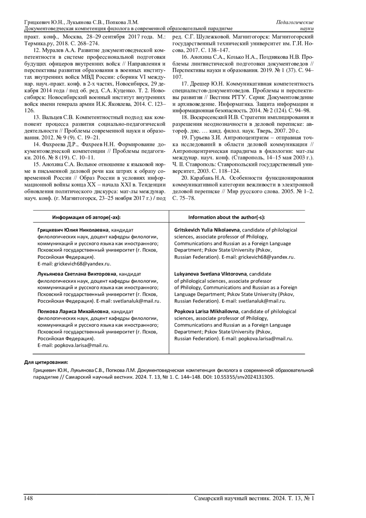 16. 	Анохина С.А., Козько Н.А., Позднякова Н.В. Проблемы лингвистической подготовки документоведов // Перспективы науки и образования. 2019. № 1 (37). С. 94-107. EDN: YXRKEX