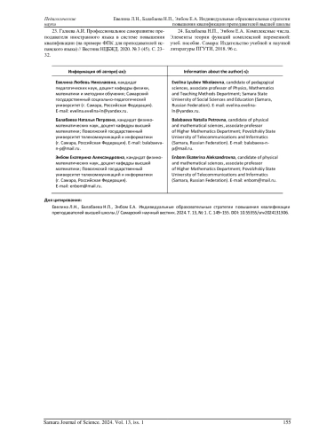2. Санько А.М. Функции преподавателей вузов в современных условиях // Вестник Самарского университета. История, педагогика, филология. 2019. Т. 25, № 1. С. 57-62. DOI: 10.18287/2542-0445-2019-25-1-57-62 EDN: SYHCQL