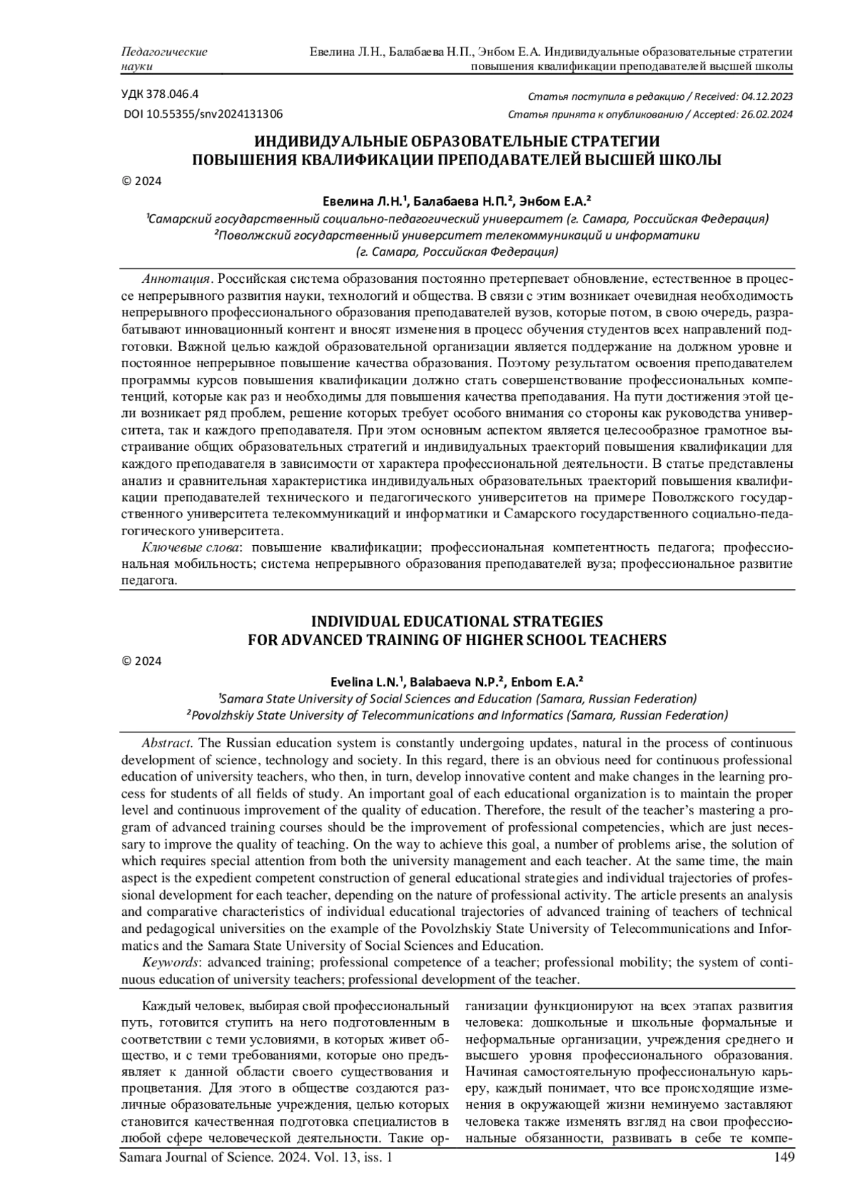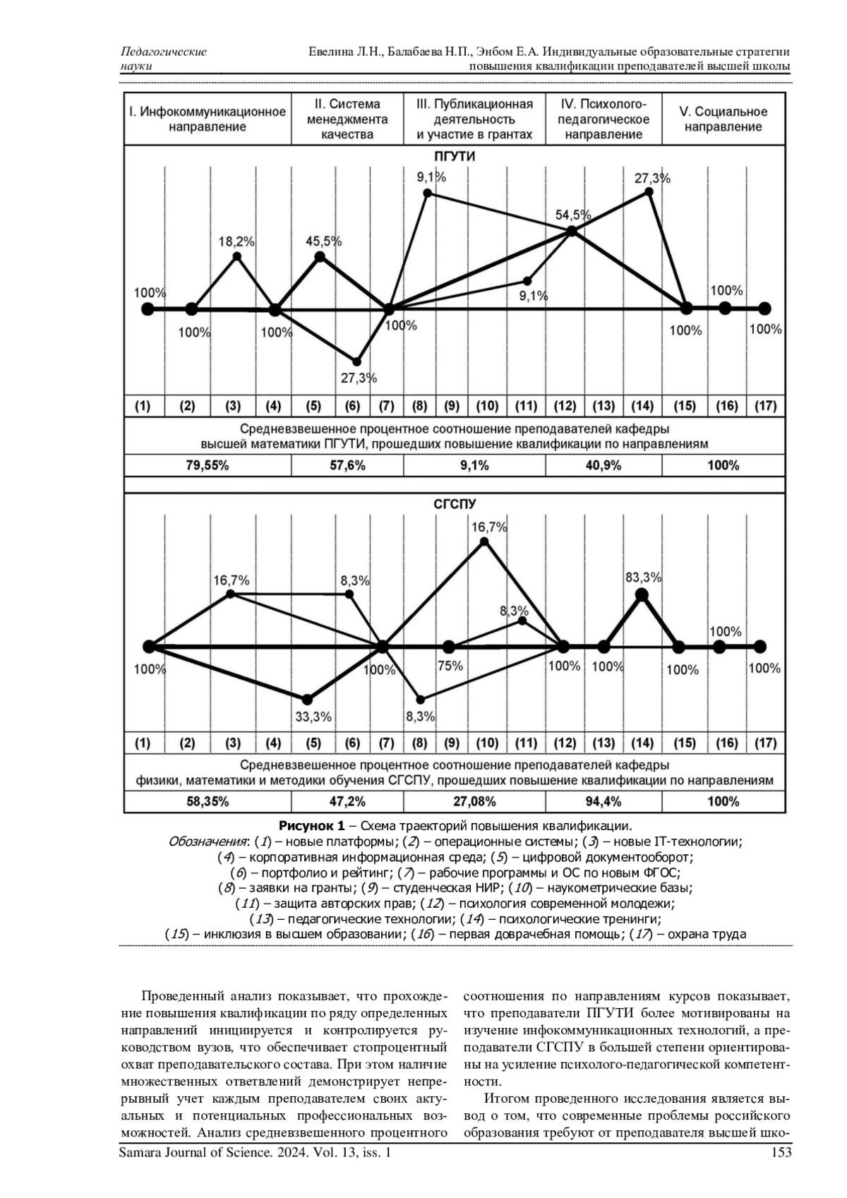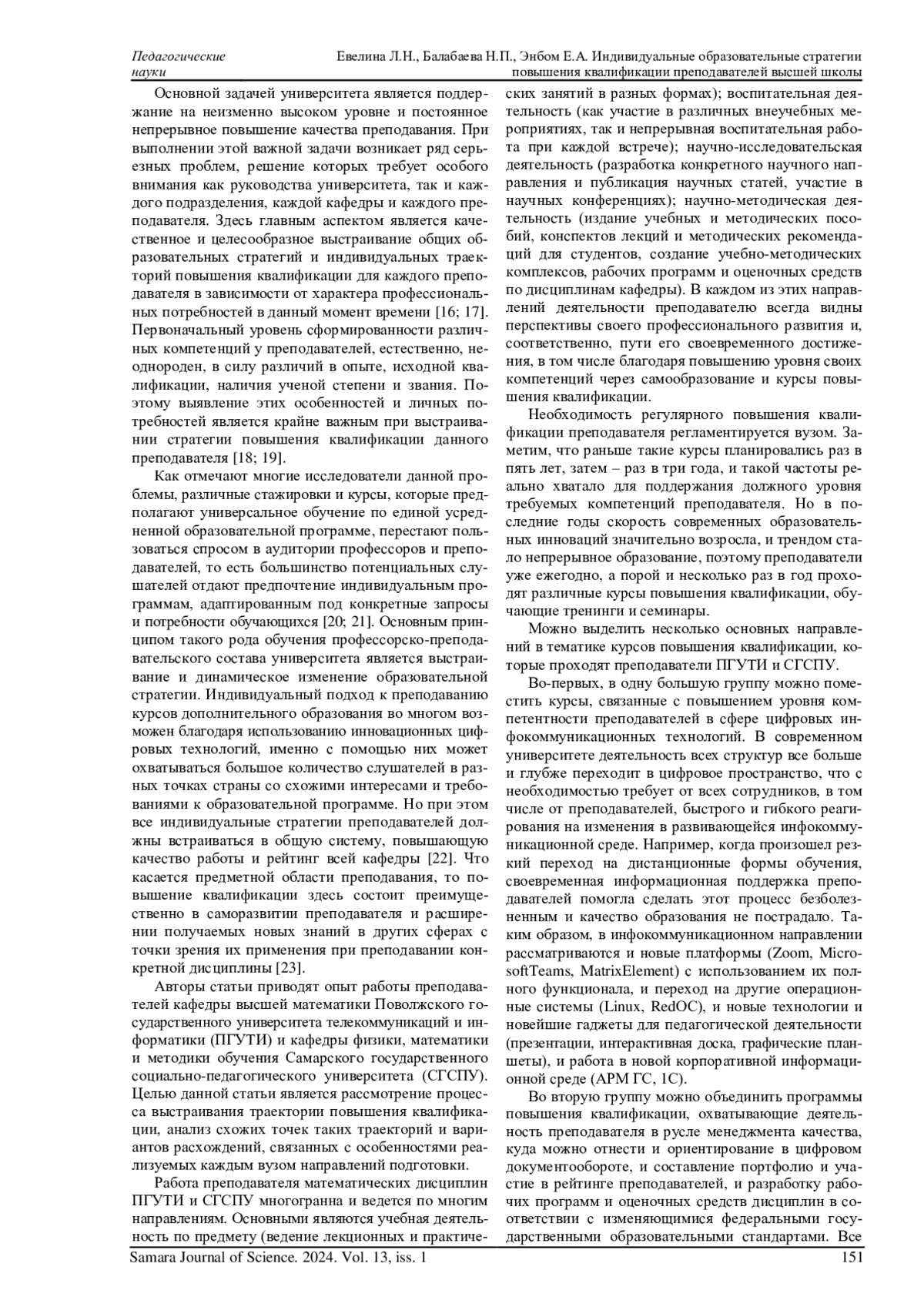 Российская система образования постоянно претерпевает обновление, естественное в процессе непрерывного развития науки, технологий и общества. В связи с этим возникает очевидная необходимость непрерывного профессионального образования преподавателей вузов, которые потом, в свою очередь, разрабатывают инновационный контент и вносят изменения в процесс обучения студентов всех направлений подготовки. Важной целью каждой образовательной организации является поддержание на должном уровне и постоянное непрерывное повышение качества образования. Поэтому результатом освоения преподавателем программы курсов повышения квалификации должно стать совершенствование профессиональных компетенций, которые как раз и необходимы для повышения качества преподавания. На пути достижения этой цели возникает ряд проблем, решение которых требует особого внимания со стороны как руководства университета, так и каждого преподавателя. При этом основным аспектом является целесообразное грамотное выстраивание общих образовательных стратегий и индивидуальных траекторий повышения квалификации для каждого преподавателя в зависимости от характера профессиональной деятельности. В статье представлены анализ и сравнительная характеристика индивидуальных образовательных траекторий повышения квалификации преподавателей технического и педагогического университетов на примере Поволжского государственного университета телекоммуникаций и информатики и Самарского государственного социально-педагогического университета.