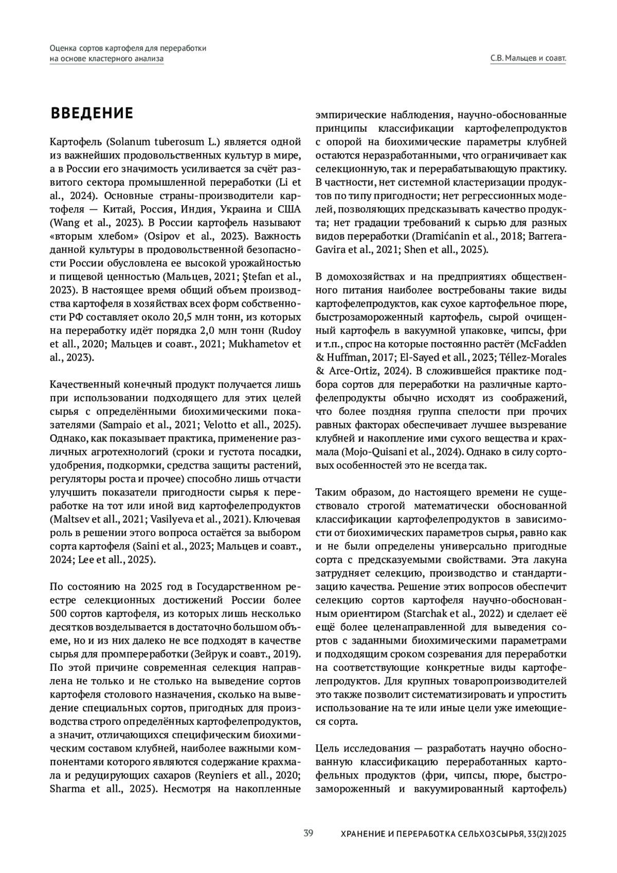 1. Зейрук, В.Н., Мальцев, С.В., Васильева, С.В., & Бызов, В.А. (2019). Современные производственные факторы, определяющие биологическую и экономическую эффективность хранения картофеля. Хранение и переработка сельхозсырья, 3, 20-28. DOI: 10.36107/spfp.2019.177
