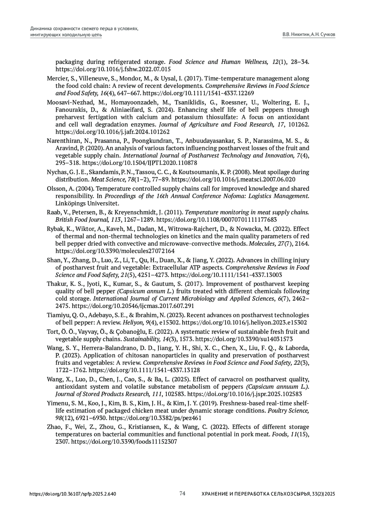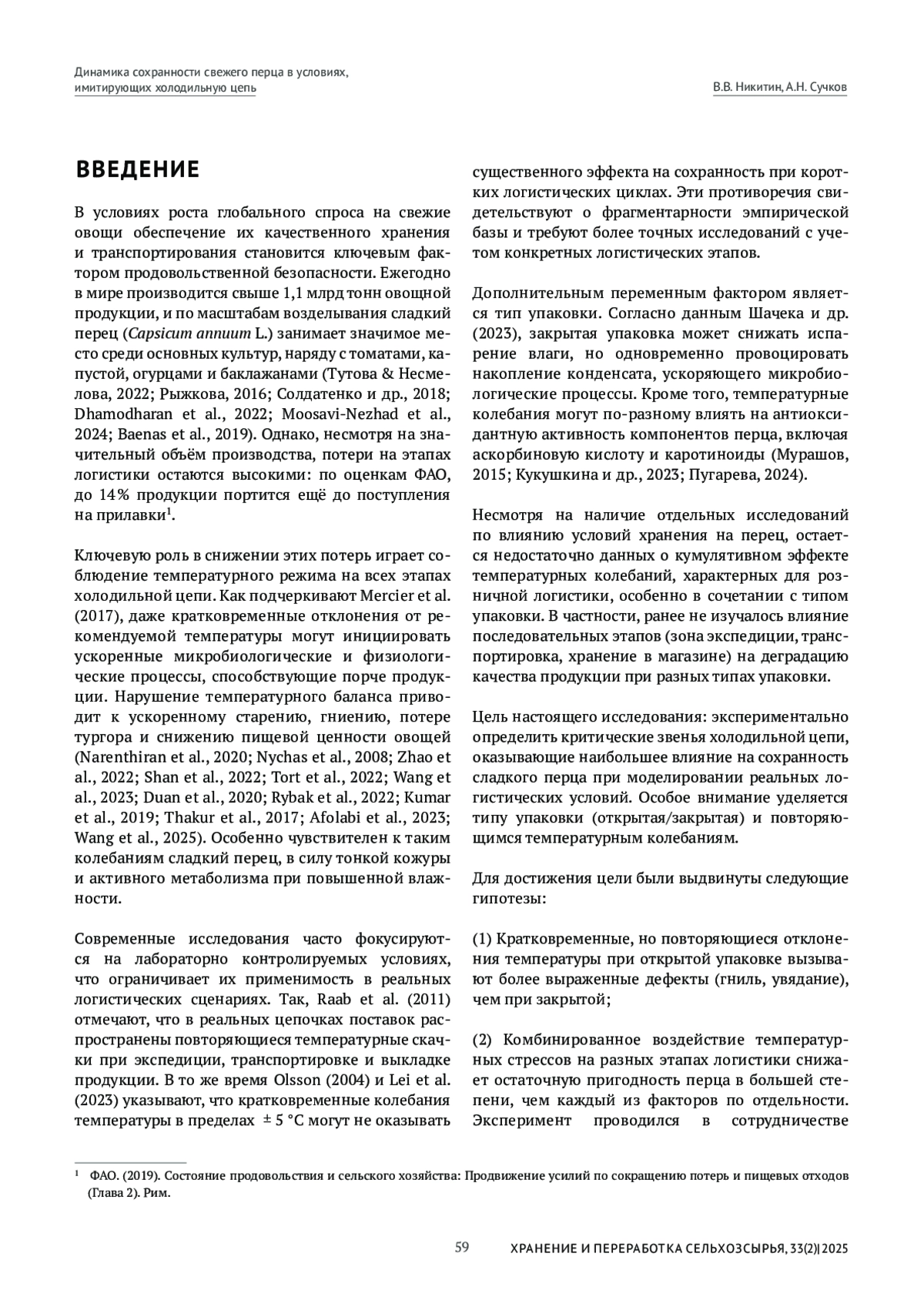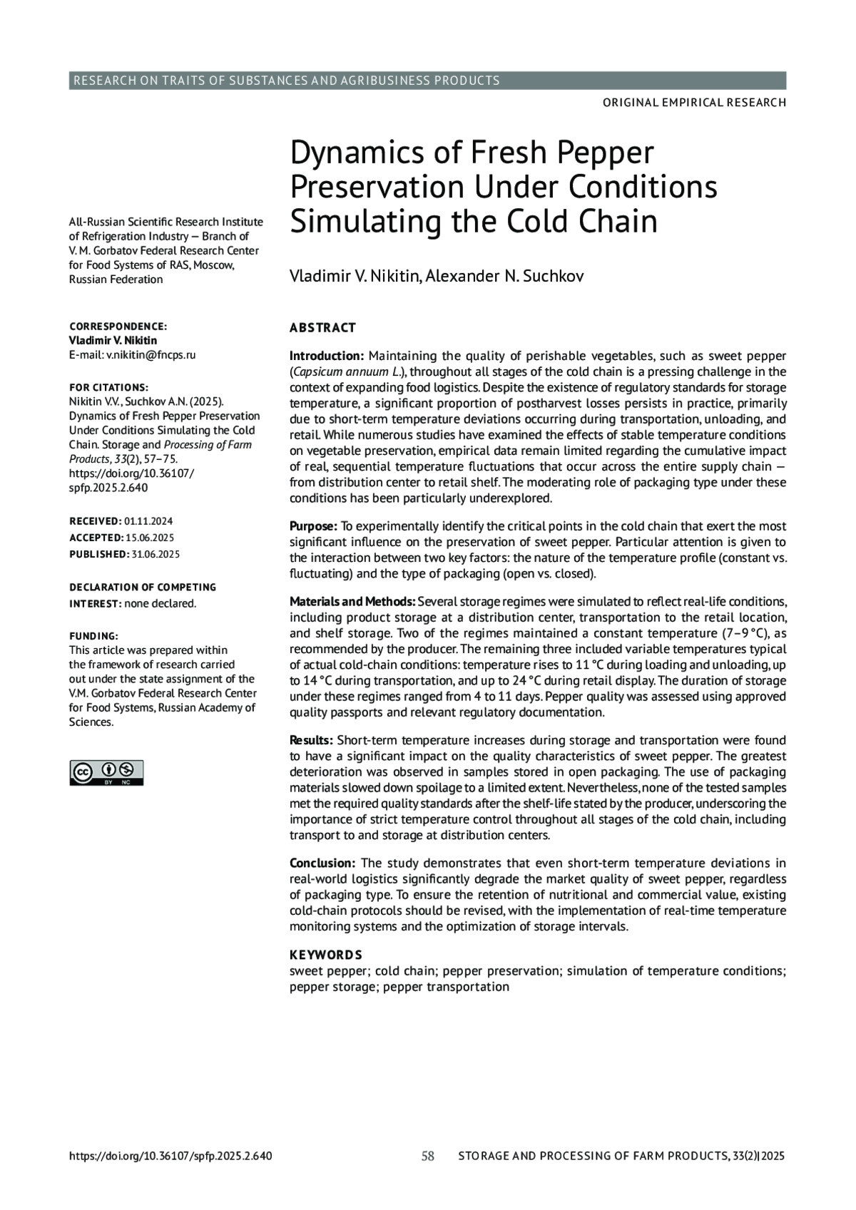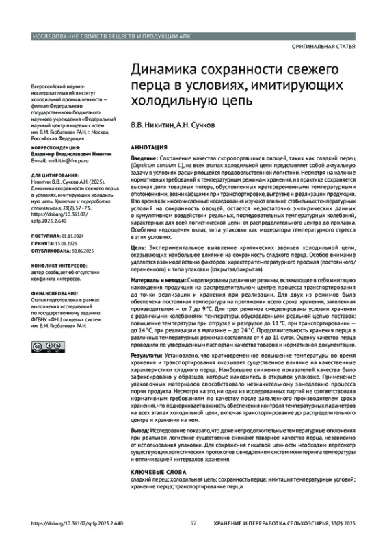 Введение: Сохранение качества скоропортящихся овощей, таких как сладкий перец ( Capsicum annuum L.), на всех этапах холодильной цепи представляет собой актуальную задачу в условиях расширяющейся продовольственной логистики. Несмотря на наличие нормативных требований к температурным режимам хранения, на практике сохраняется высокая доля товарных потерь, обусловленных кратковременными температурными отклонениями, возникающими при транспортировке, выгрузке и реализации продукции. В то время как многочисленные исследования изучают влияние стабильных температурных условий на сохранность овощей, остается недостаточно эмпирических данных о кумулятивном воздействии реальных, последовательных температурных колебаний, характерных для всей логистической цепи: от распределительного центра до прилавка. Особенно недооценен вклад типа упаковки как модератора температурного стресса в этих условиях.