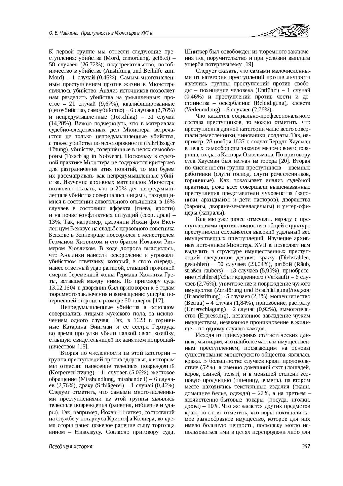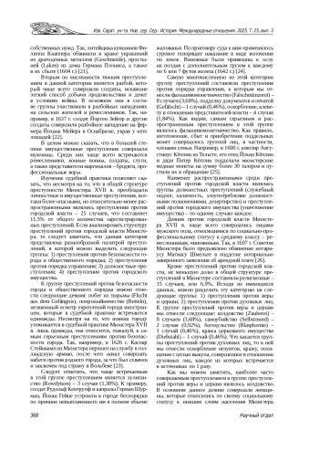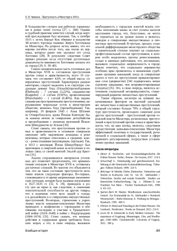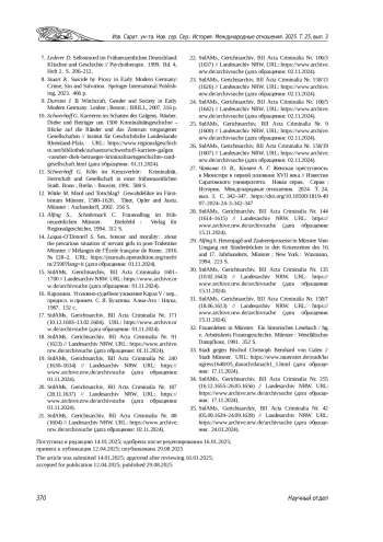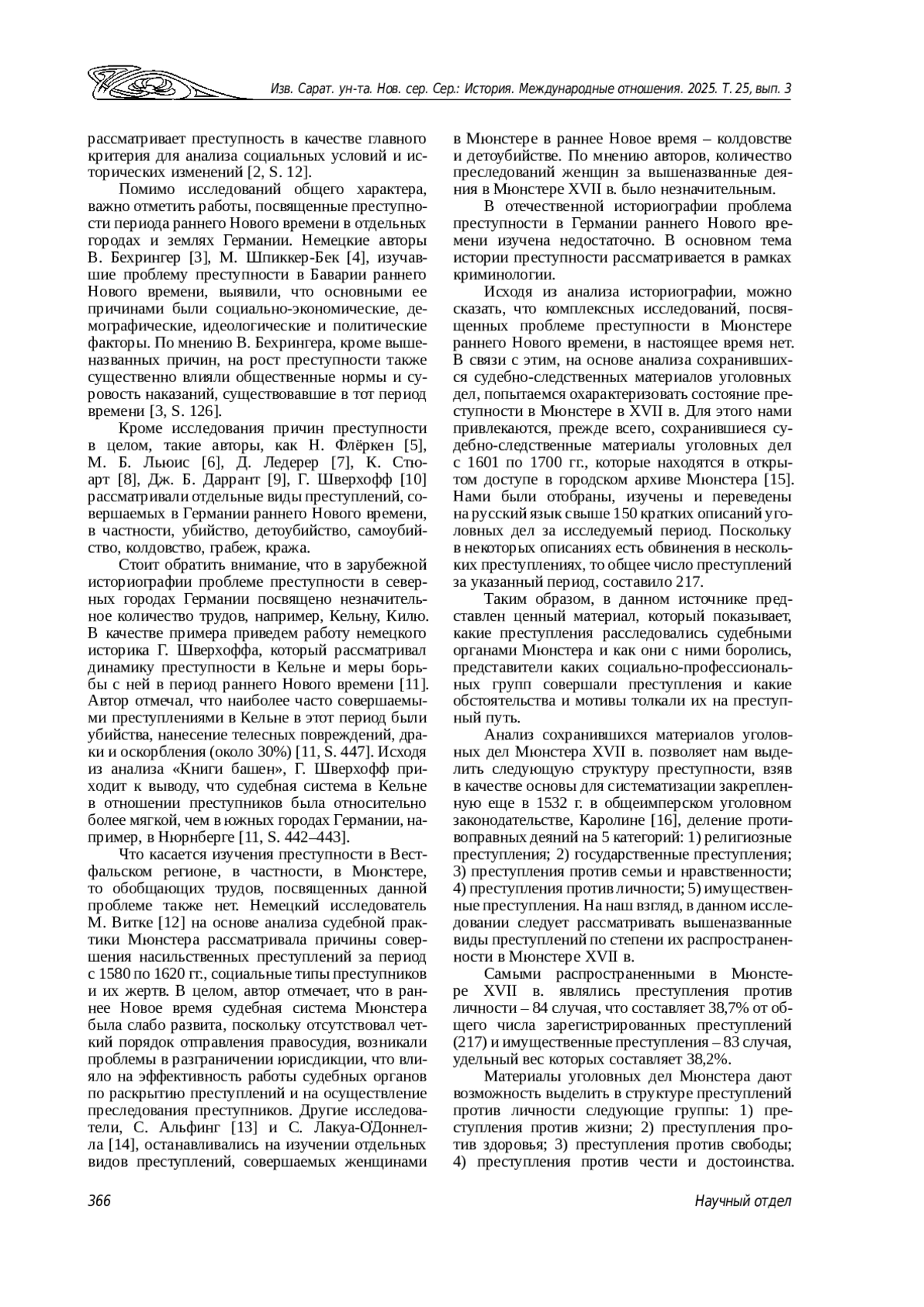 27. Чавкина О. В., Канаев А. Г. Женская преступность в Мюнстере в первой половине XVII века // Известия Саратовского университета. Новая серия. Серия: История. Международные отношения. 2024. Т. 24, вып. 3. С. 342-347. DOI: 10.18500/1819-4907-2024-24-3-342-347 EDN: EOYMHX