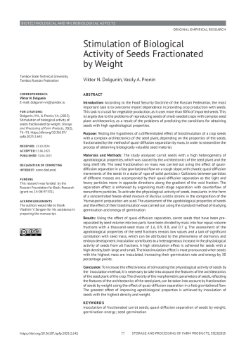 Материалы и методы: Объектом исследования являлись семена моркови с высокой неоднородностью агробиологических свойств, обусловленной архитектоникой семенного растения и длительным сроком хранения. Фракционирование семян по массе проведено с использованием эффекта квазидиффузионной сепарации в быстром гравитационном потоке на шероховатом скате, при хаотических квазидиффузионных перемещениях семян в состоянии «газа твердых частиц». Столкновения частиц в потоке сопровождаются их квазидиффузионной сепарацией при встречном перемещении легких и тяжелых частиц вдоль градиента доли пустот. Для биостимулирования семян использованы инокулянты в виде концентрированной сублимированной смеси штаммов Bacillus subtilis в составе препарата «Гумаспорин». Оценка агробиологических свойств семян и эффекта их биостимулирования проведена с использованием стандартного метода исследования всхожести и энергии прорастания.