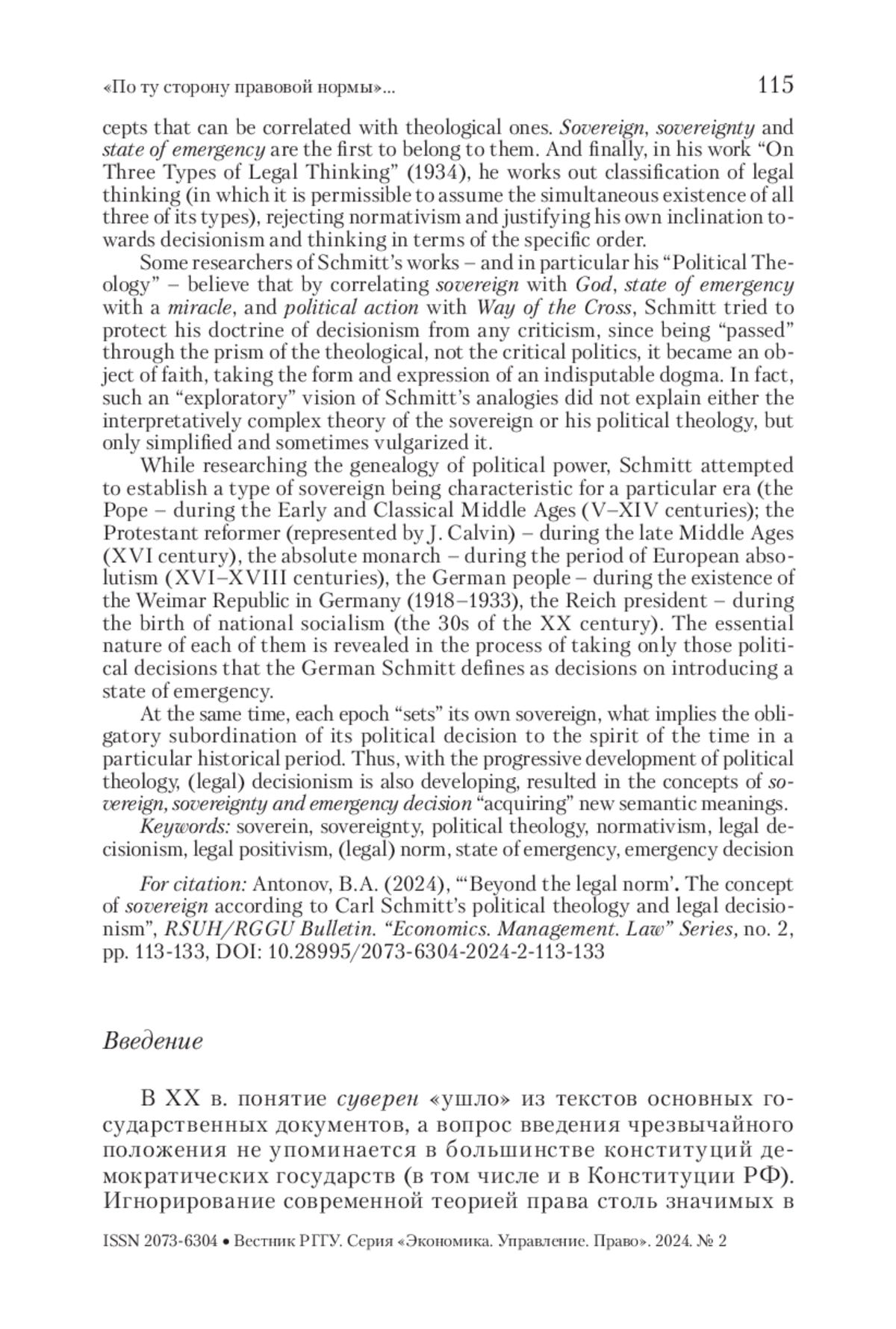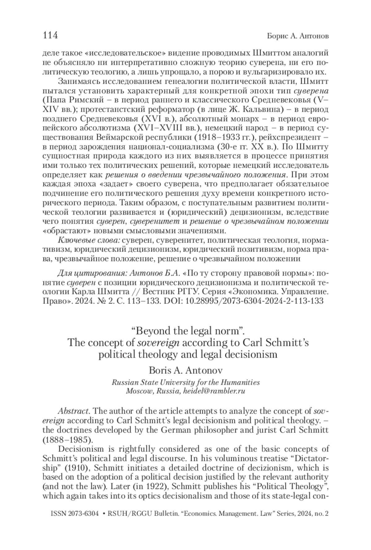 Автор статьи предпринимает попытку анализа понятия суверен с позиции юридического децизионизма и политической теологии – учений, разработанных немецким философом и правоведом Карлом Шмиттом (1888–1985).