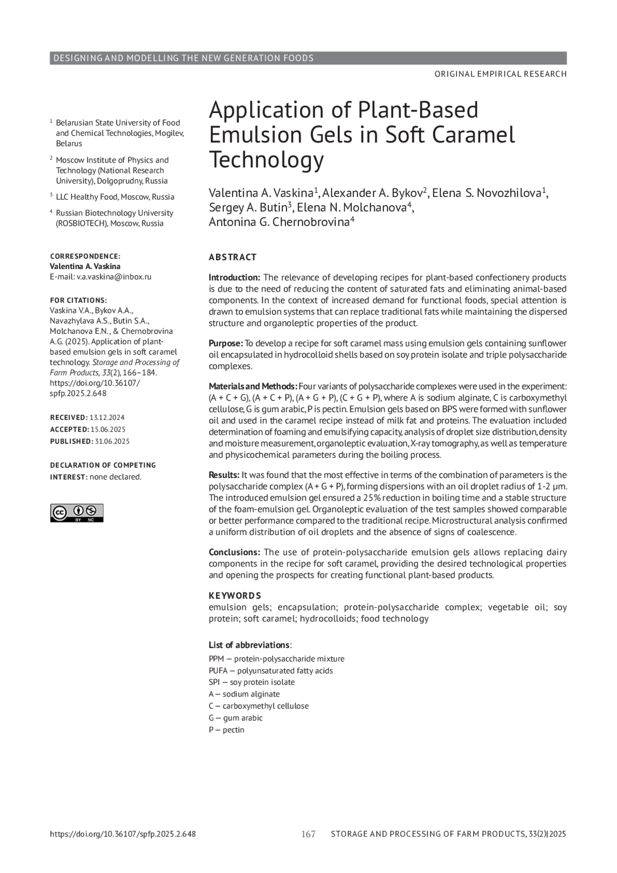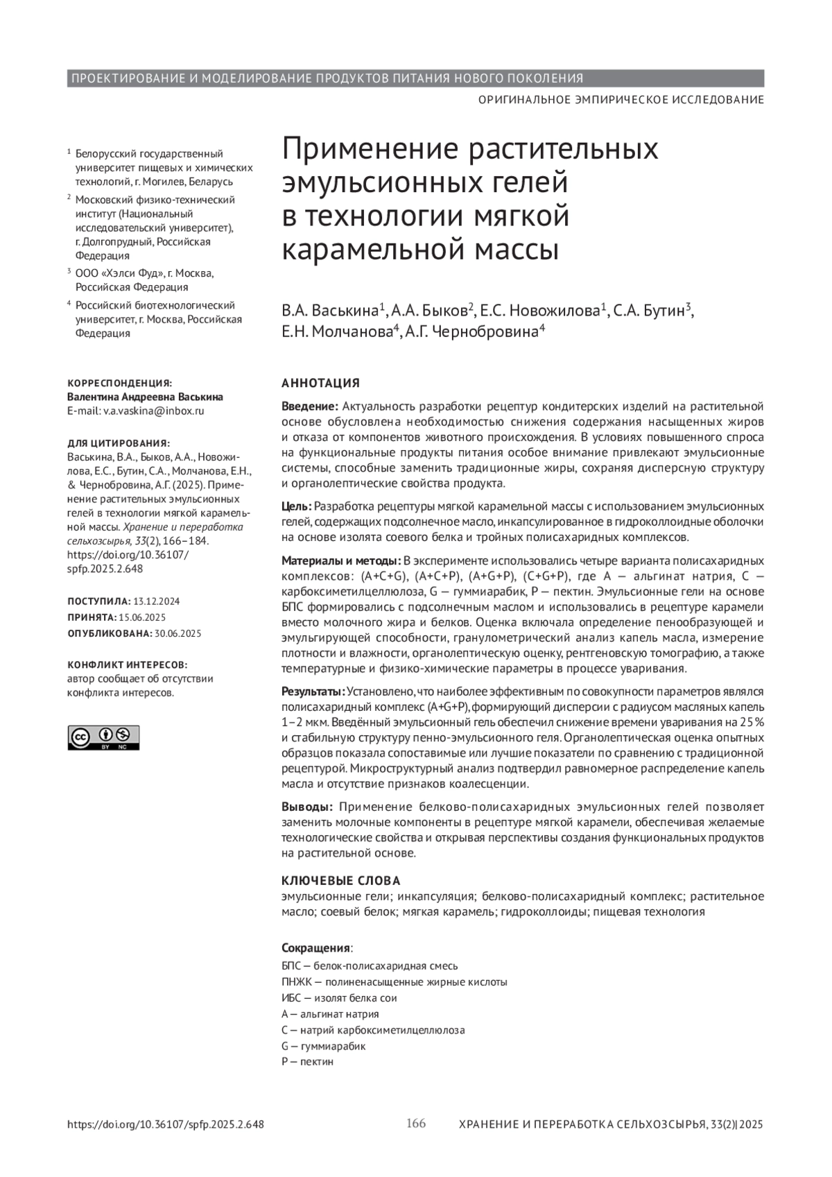 Выводы: Применение белково-полисахаридных эмульсионных гелей позволяет заменить молочные компоненты в рецептуре мягкой карамели, обеспечивая желаемые технологические свойства и открывая перспективы создания функциональных продуктов на растительной основе.