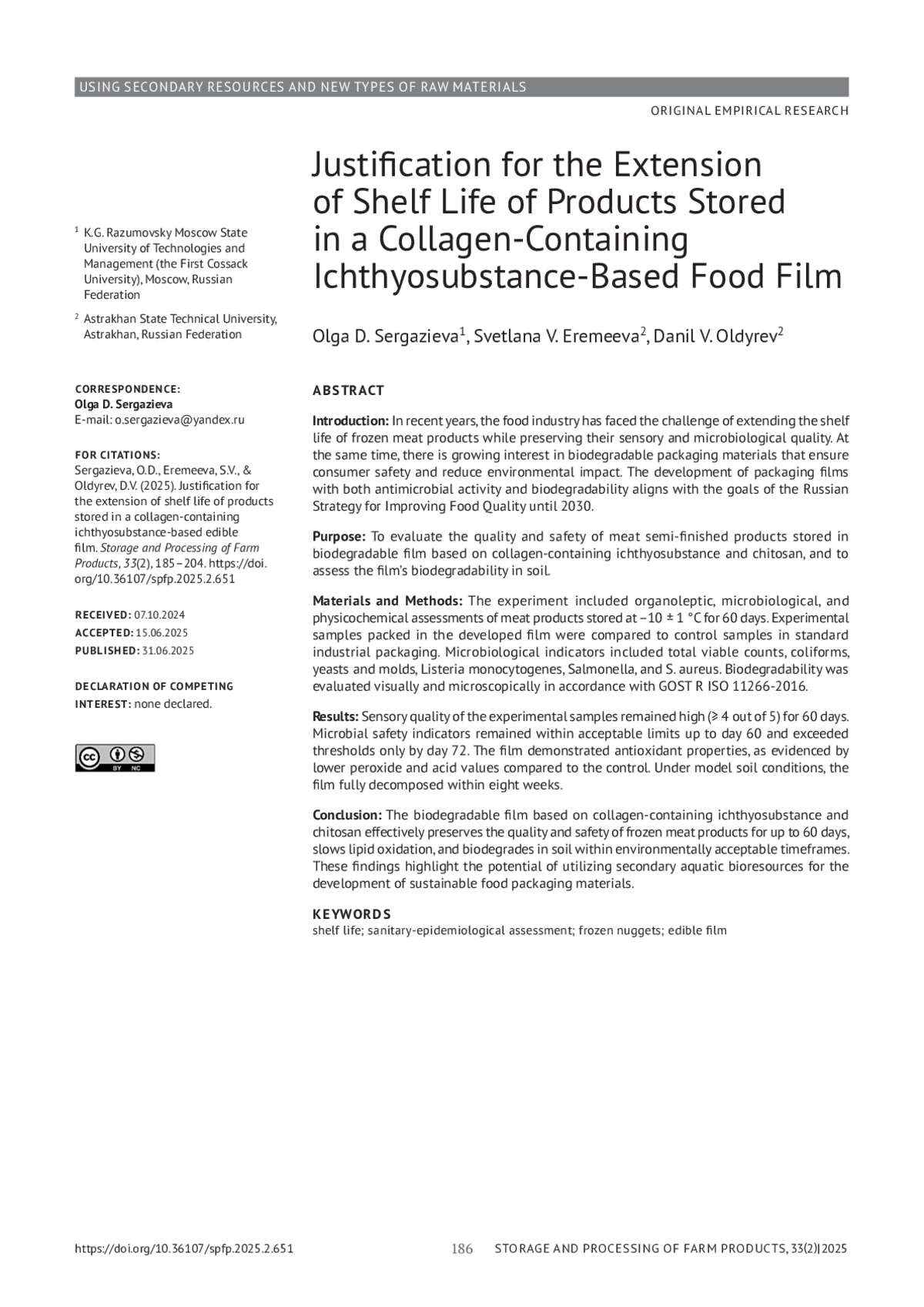Цель: Комплексная оценка качества и безопасности мясных полуфабрикатов, упакованных в биоразлагаемую пленку на основе коллагенсодержащей ихтиосубстанции и хитозана, а также изучение степени биоразложения пленки в почве.