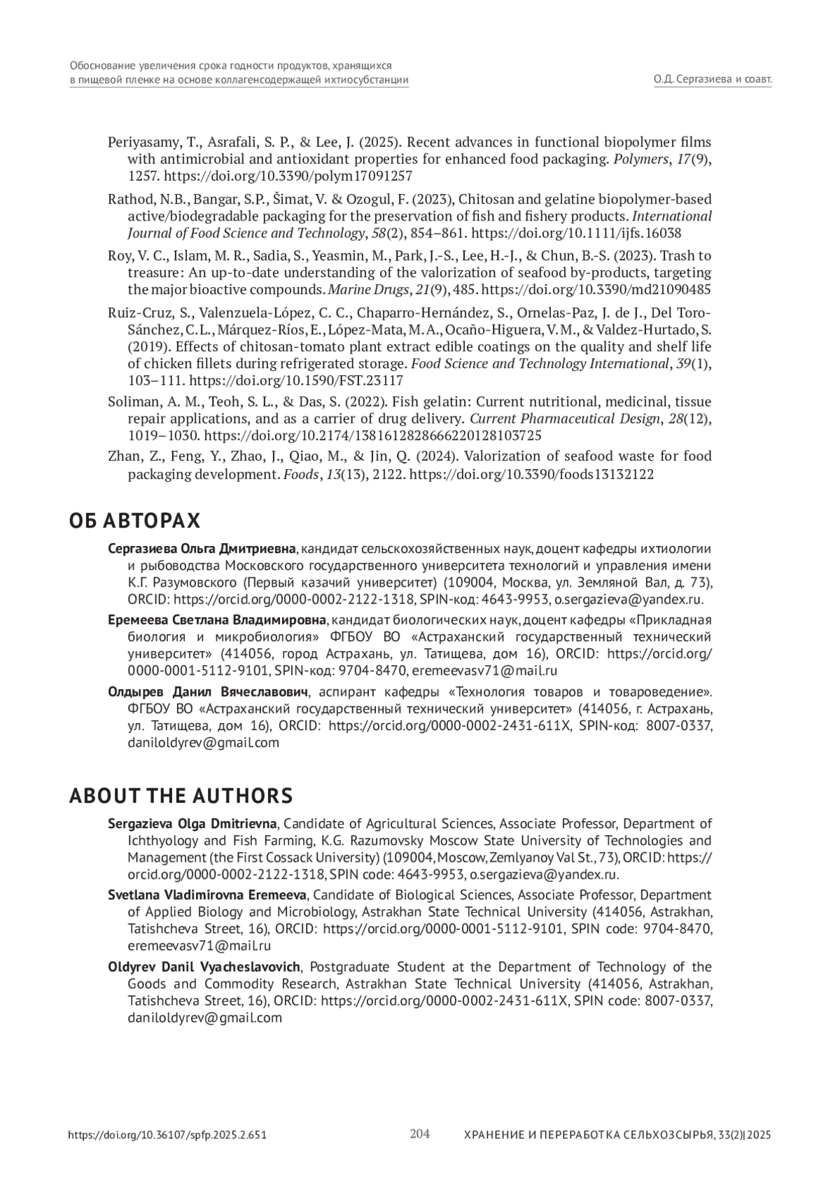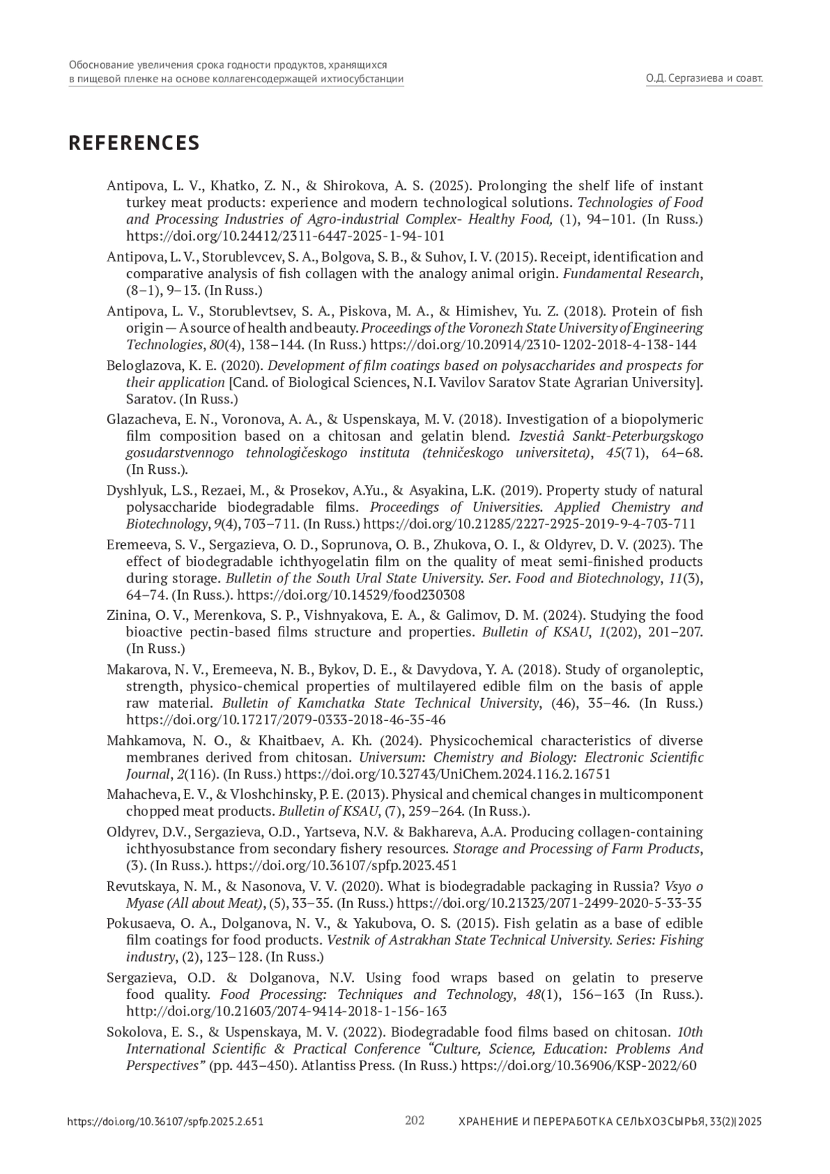 6. Еремеева С.В., Сергазиева О.Д., Сопрунова О.Б., Жукова О.И., & Олдырев Д.В. (2023). Влияние биоразлагаемой ихтиожелатиновой пленки на качество мясных полуфабрикатов при хранении. Вестник Южно-Уральского государственного университета. Серия: Пищевые и биотехнологии, 11(3), 64-74. DOI: 10.14529/food230308