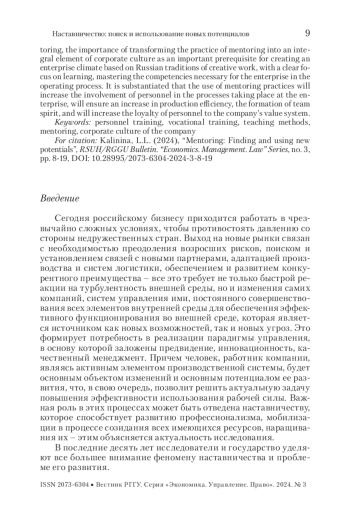 4. Винокурова 2022 - Винокурова А.Е. Применение проектного подхода для сохранения критически важных компетенций предприятия через реализацию комплексной HR-программы наставничества // Вестник РГГУ. Серия «Экономика. Управление. Право». 2022. № 1. С. 82-90. https://doi.org/10.28995/2073-6304-2022-1-82-90.