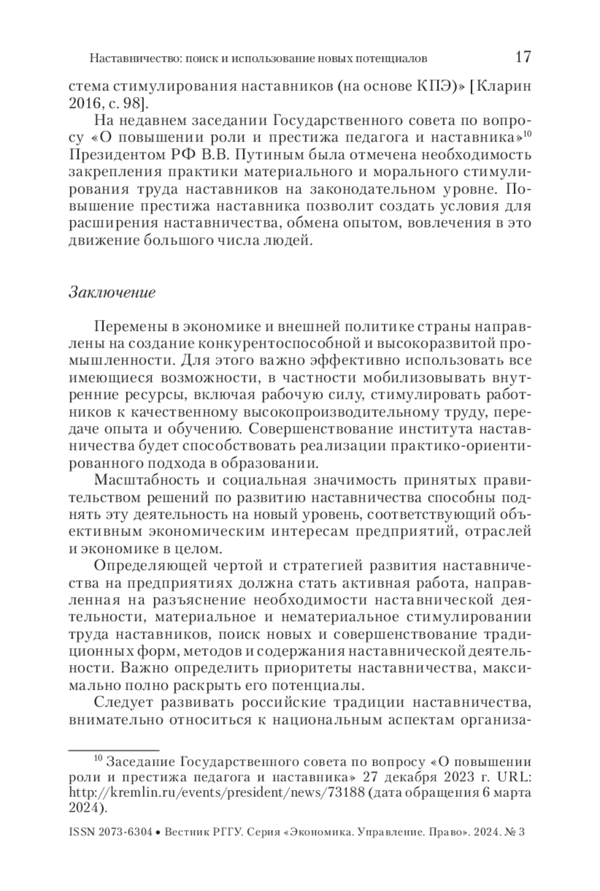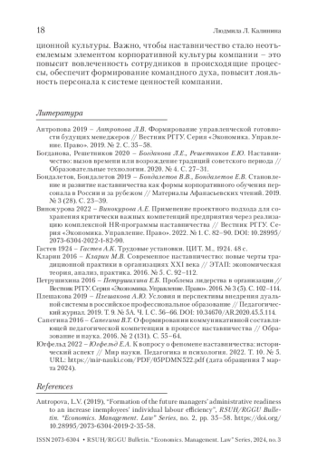 5. Гастев 1924 - Гастев А.К. Трудовые установки. ЦИТ. М., 1924. 48 с. Кларин 2016 - Кларин М.В. Современное наставничество: новые черты традиционной практики в организациях XXI века // ЭТАП: экономическая теория, анализ, практика. 2016. № 5. С. 92-112.