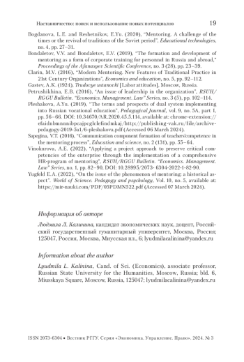 2. Богданова, Решетников 2020 - Богданова Л.Е., Решетников Е.Ю. Наставничество: вызов времени или возрождение традиций советского периода // Образовательные технологии. 2020. № 4. С. 27-31.