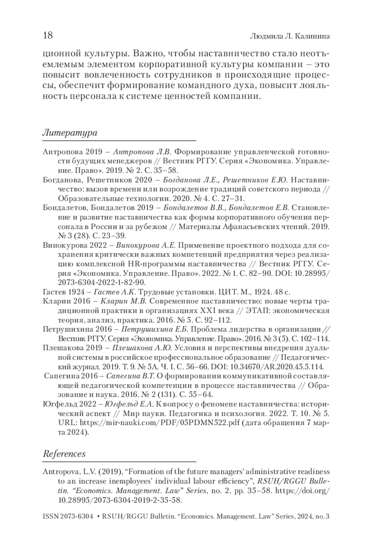 1. Антропова 2019 - Антропова Л.В. Формирование управленческой готовности будущих менеджеров // Вестник РГГУ. Серия «Экономика. Управление. Право». 2019. № 2. С. 35-58.