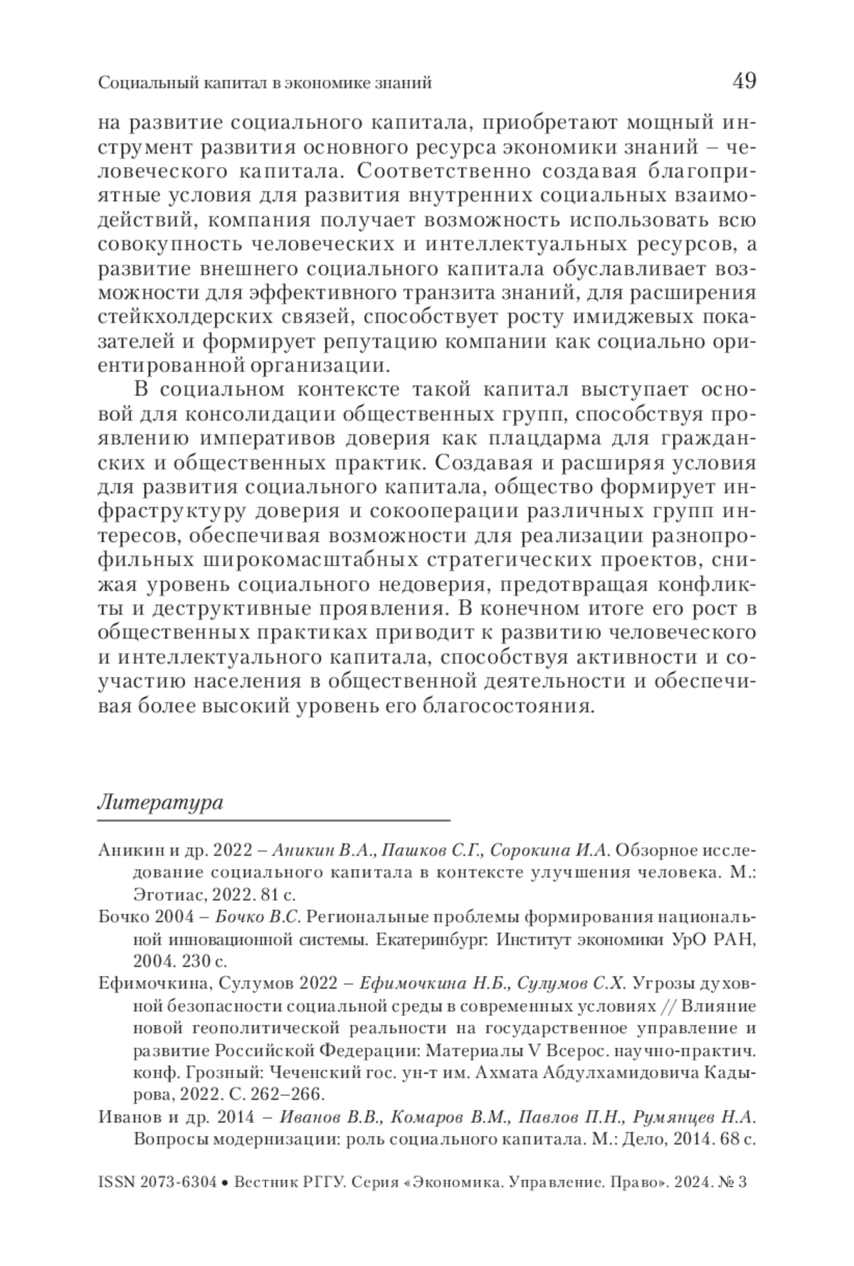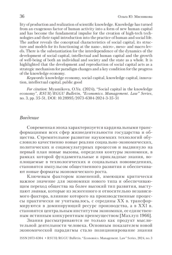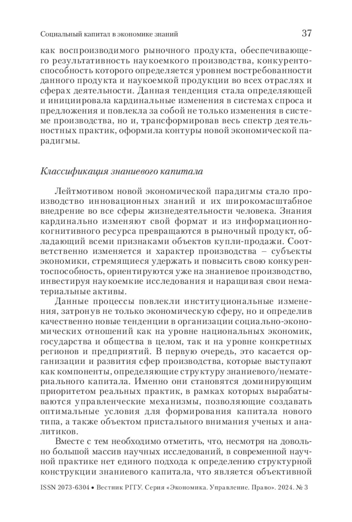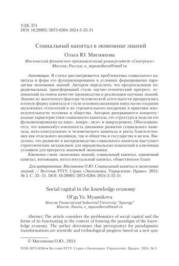 В статье рассматривается проблематика социального капитала и форм его функционирования в условиях формирования парадигмы экономики знаний. Автором определено, что предпосылками парадигмальных трансформаций стали научно-технический прогресс, основанный на новом качестве производства и реализации научных знаний. Знания из экзогенного фактора человеческой деятельности превратились в новую форму капитала и стали основополагающим импульсом создания наукоемких технологий и их стремительного внедрения в практики жизнедеятельности человека и общества. Автором раскрываются концептуальные характеристики социального капитала, его структура и модели его функционирования на нано-, микро-, мезо- и макроуровнях. Обосновывается, что взаимообусловленность динамики развития социального капитала, интеллектуального и человеческого капитала и роста благосостояния как отдельного индивида, так и общества и государства в целом. Выделено, что развитие и воспроизводство социального капитала выступает стратегическим механизмом для парадигмальных изменений и ключевым условием для прогресса знаниевой экономики.